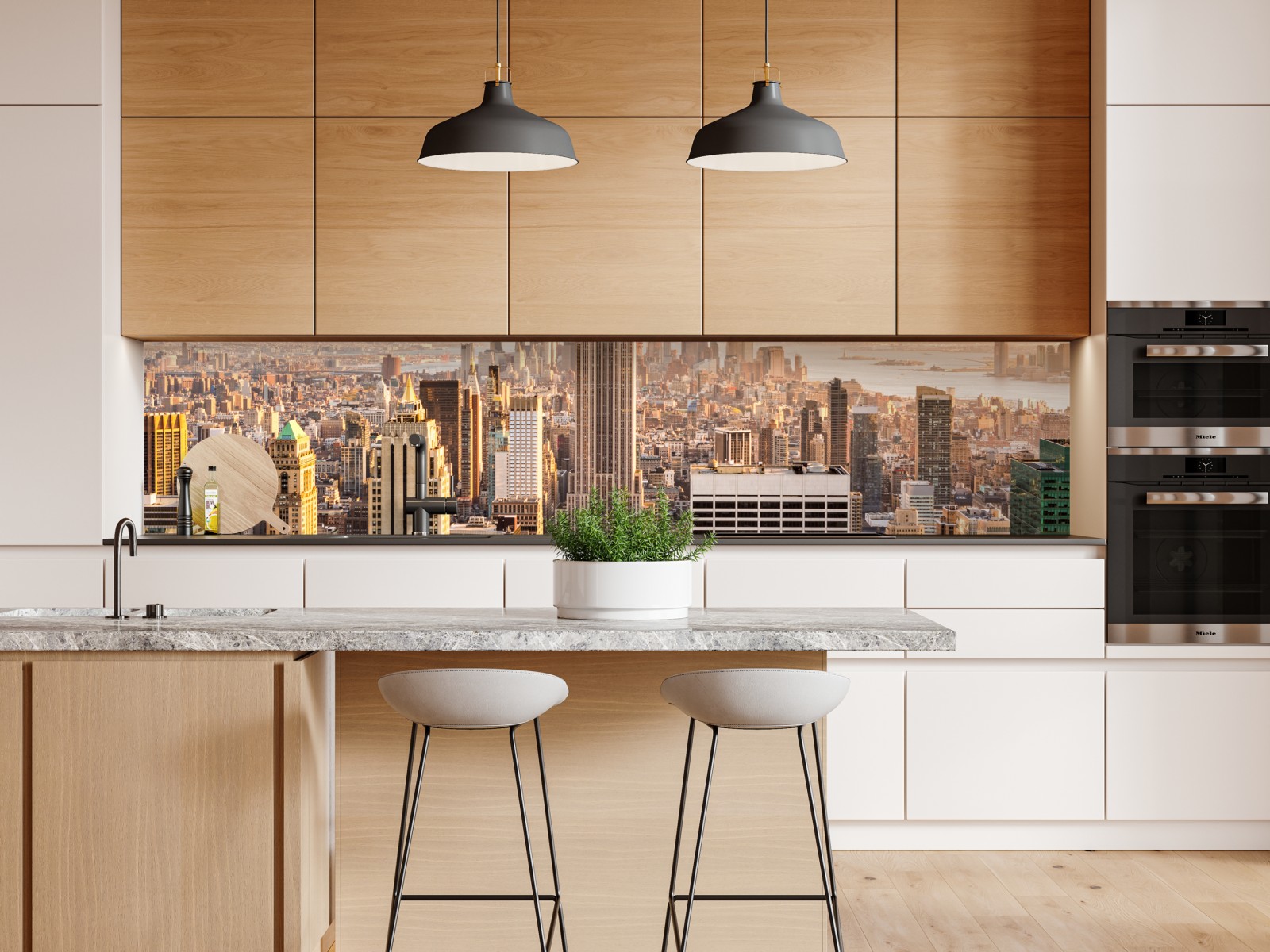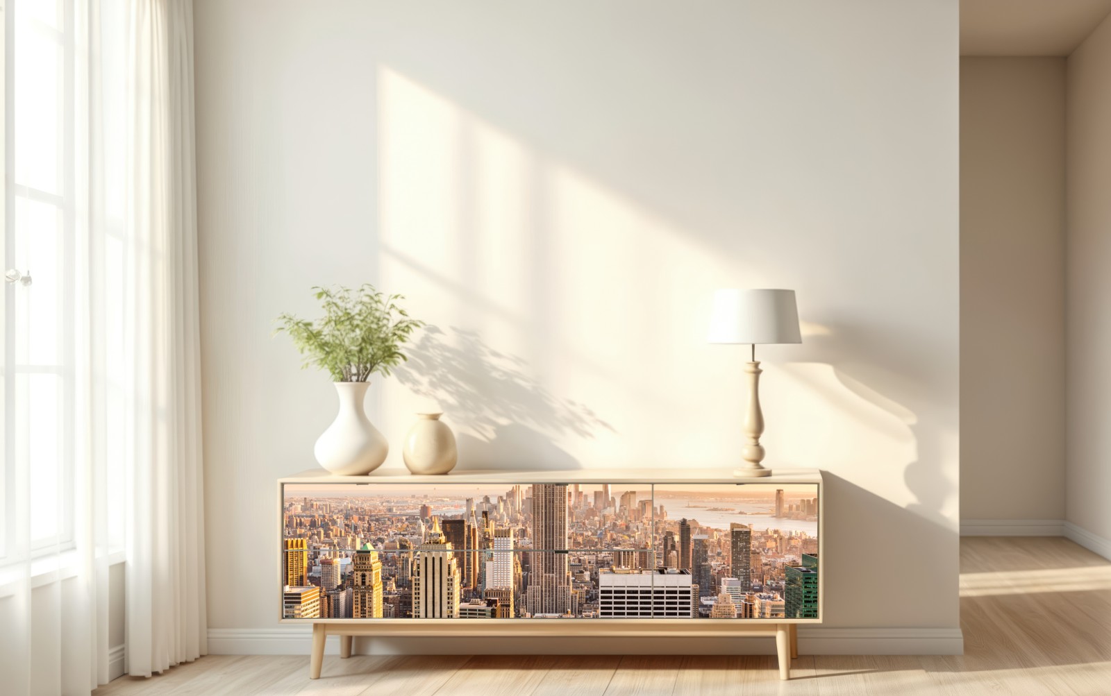 Atemberaubender Luftblick auf New York bei der goldenen Stunde, ideal für moderne Wohnräume und urbane Dekore.