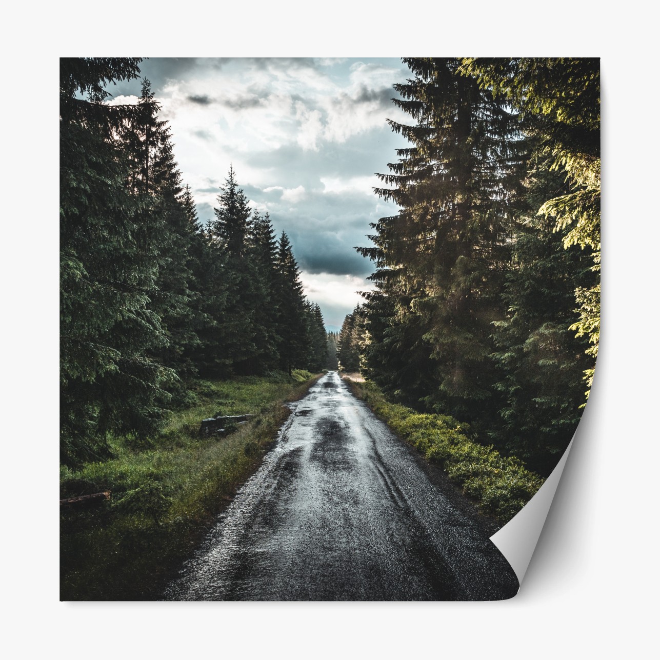 Repositionierbarer Aufkleber Waldweg durch neblige kiefern