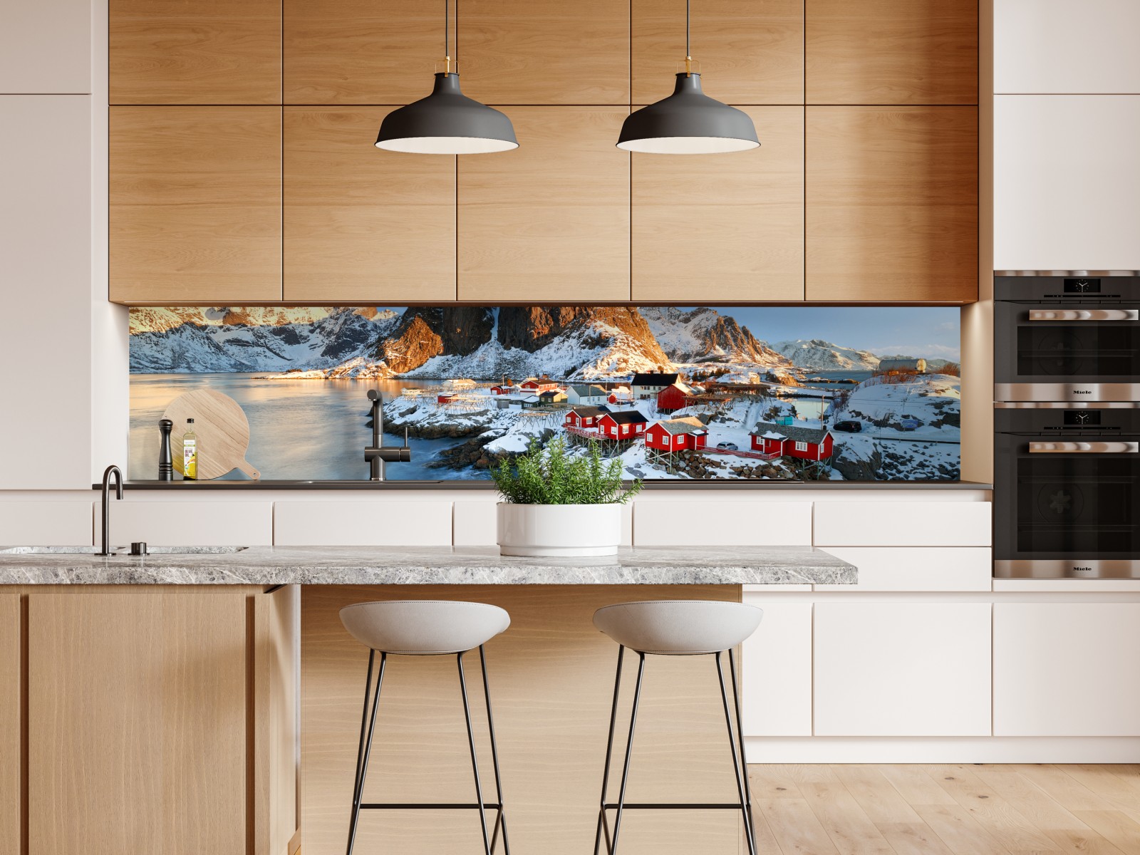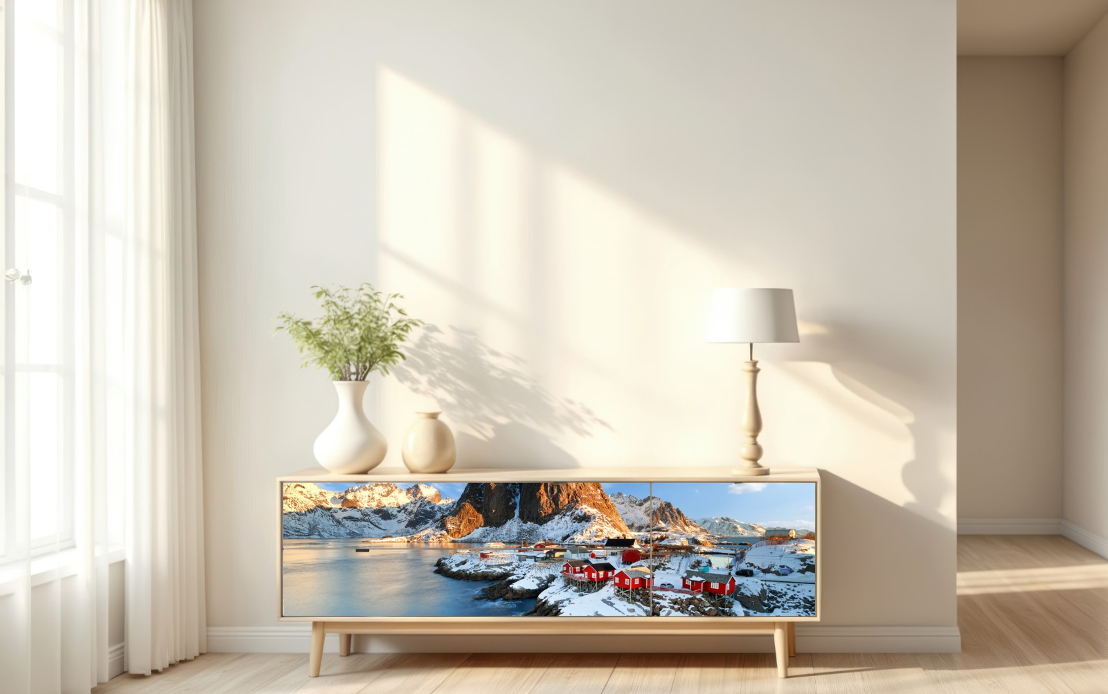 beeindruckender ausblick auf schneebedeckte berge und rote fischerhütten an der küste von Hamnøy, ideal um nordische ruhe und natur in ihr zuhause zu bringen.