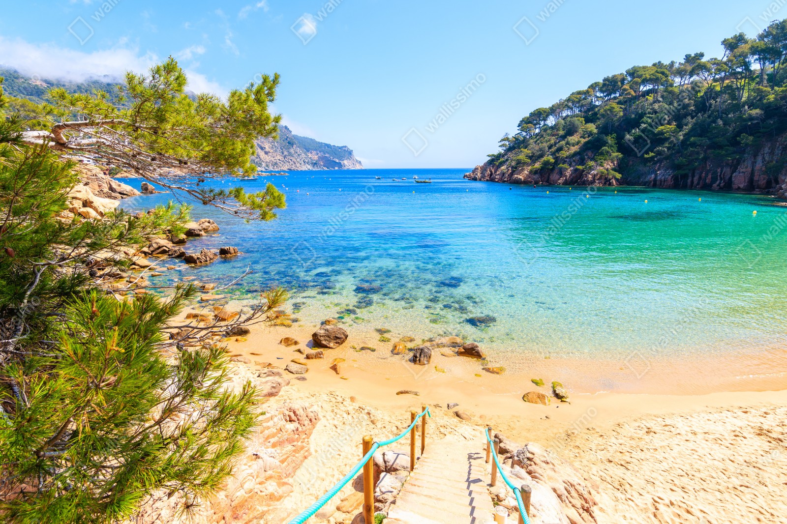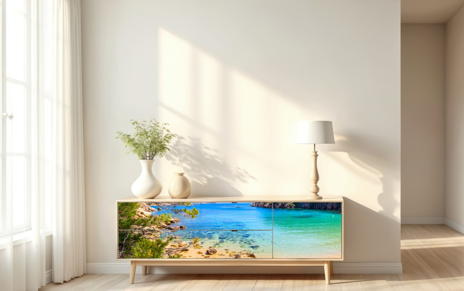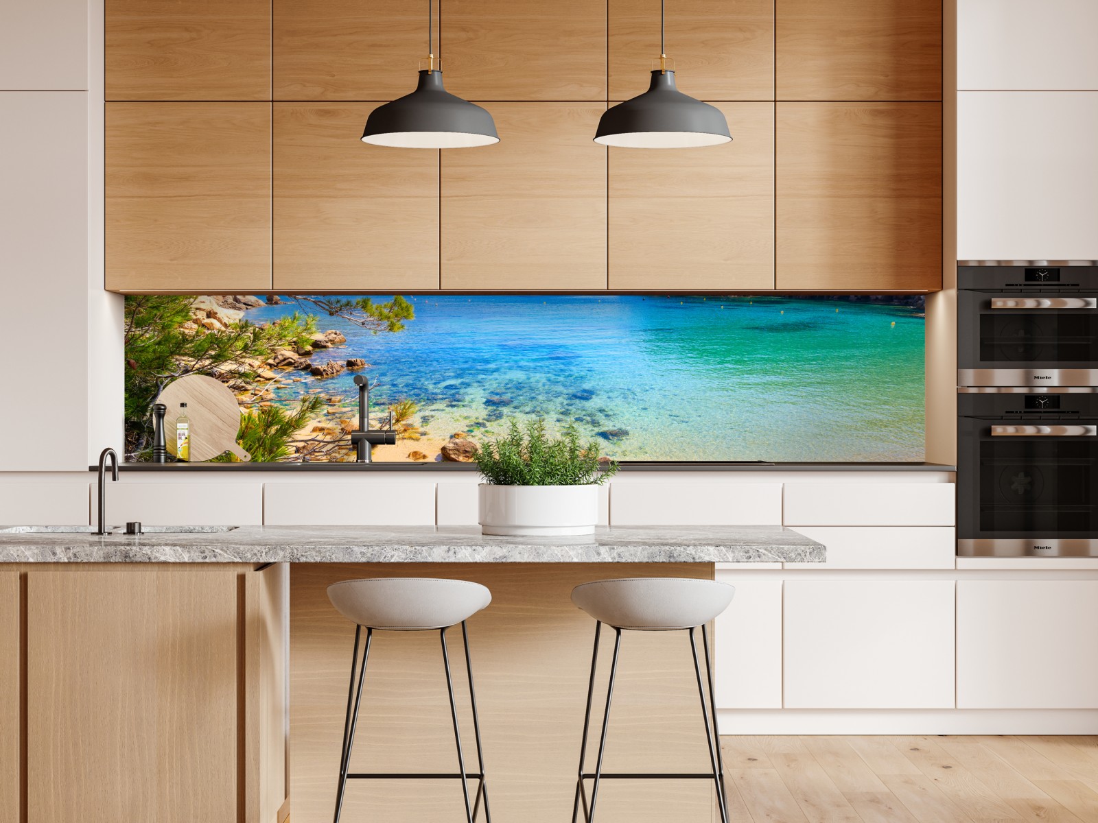 Türkisblaues Wasser und goldener Sand zwischen pinienbewachsenen Klippen schaffen eine ruhige mediterrane Atmosphäre für Ihr Zuhause.