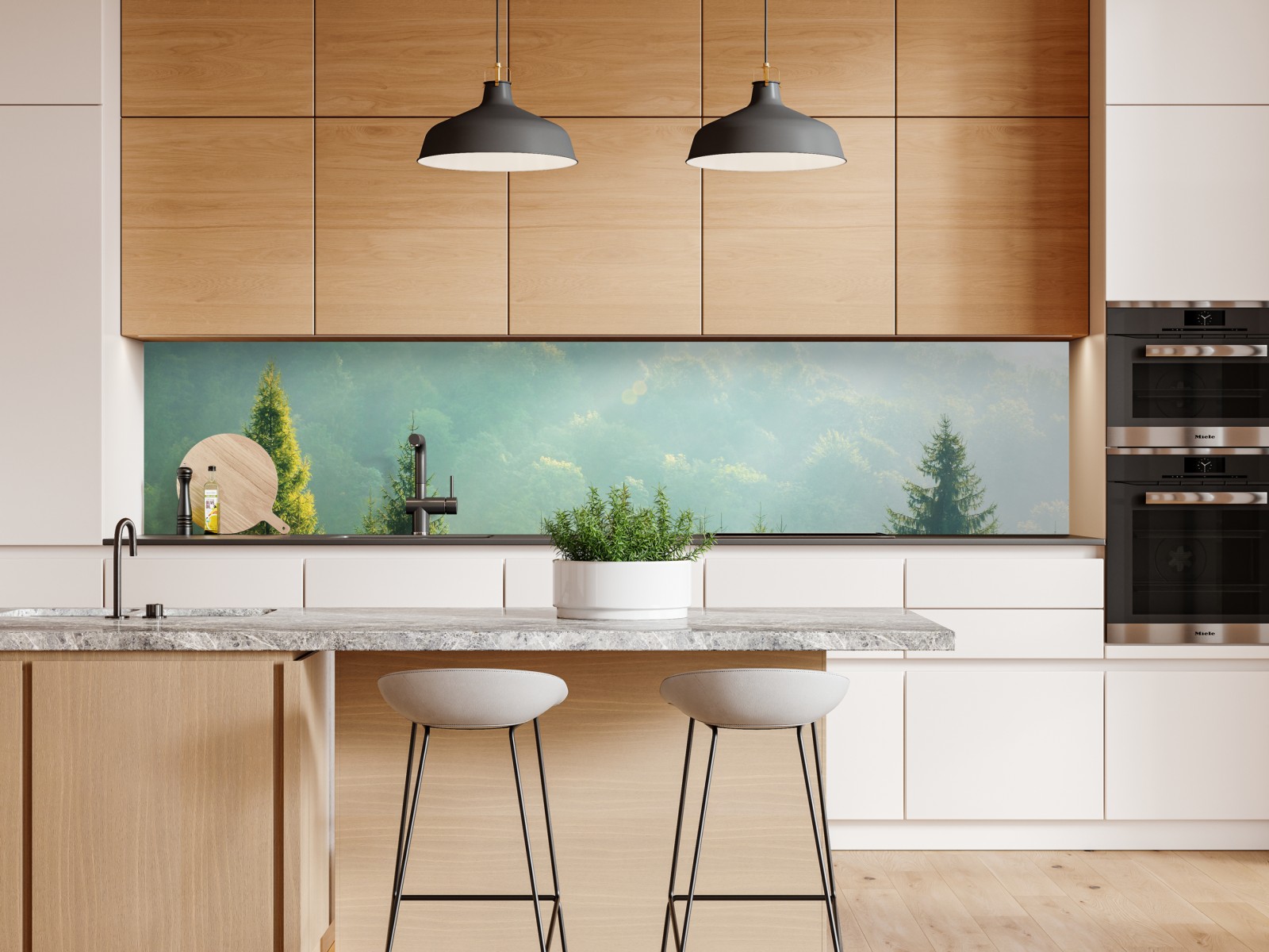 Repositionierbarer Aufkleber neblige fichtenspitzen im morgenlicht