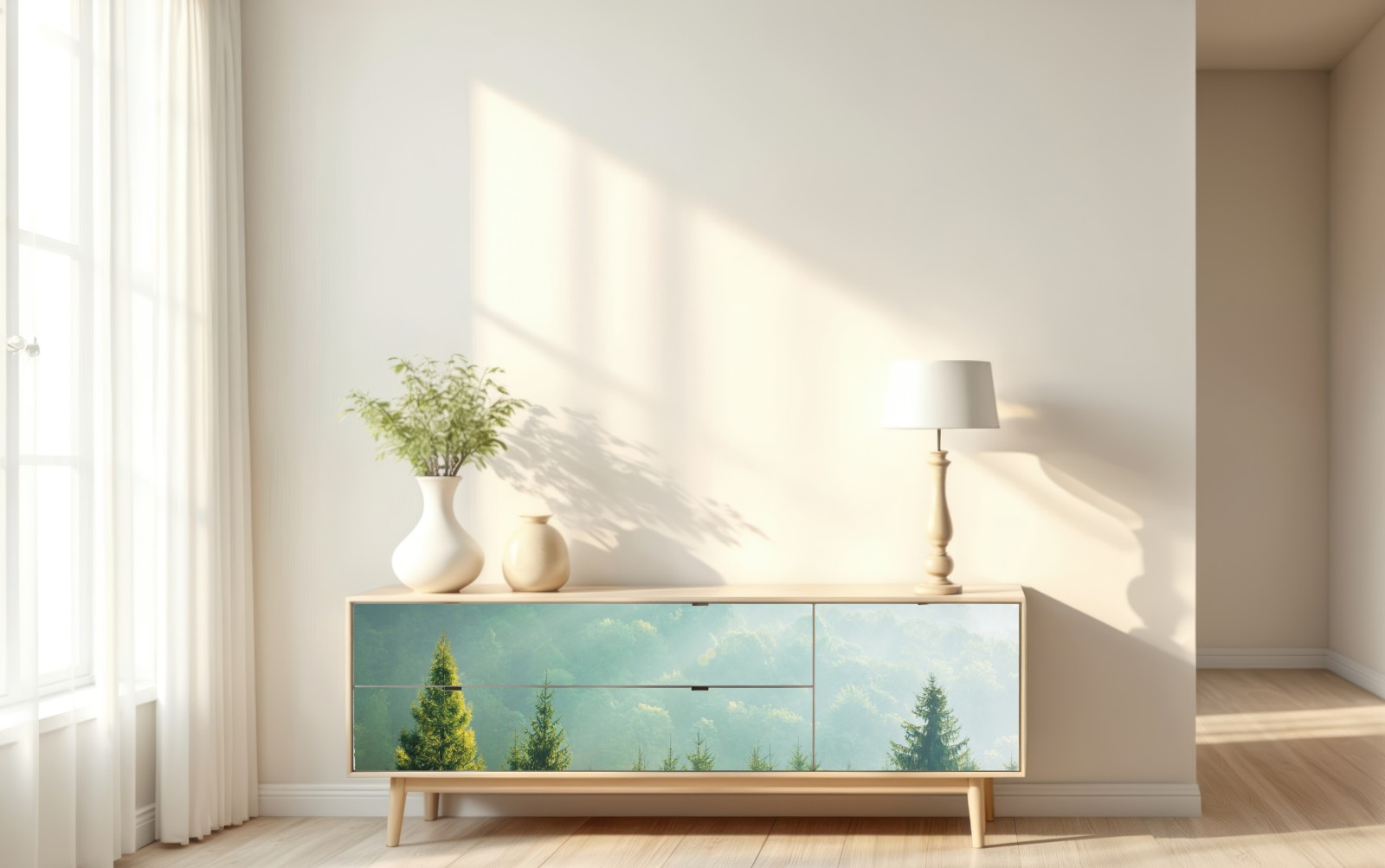 Eine ruhige Waldlandschaft mit morgendlichem Nebel und Sonnenstrahlen, die eine beruhigende naturnahe Atmosphäre schaffen.