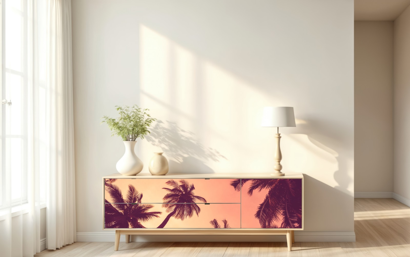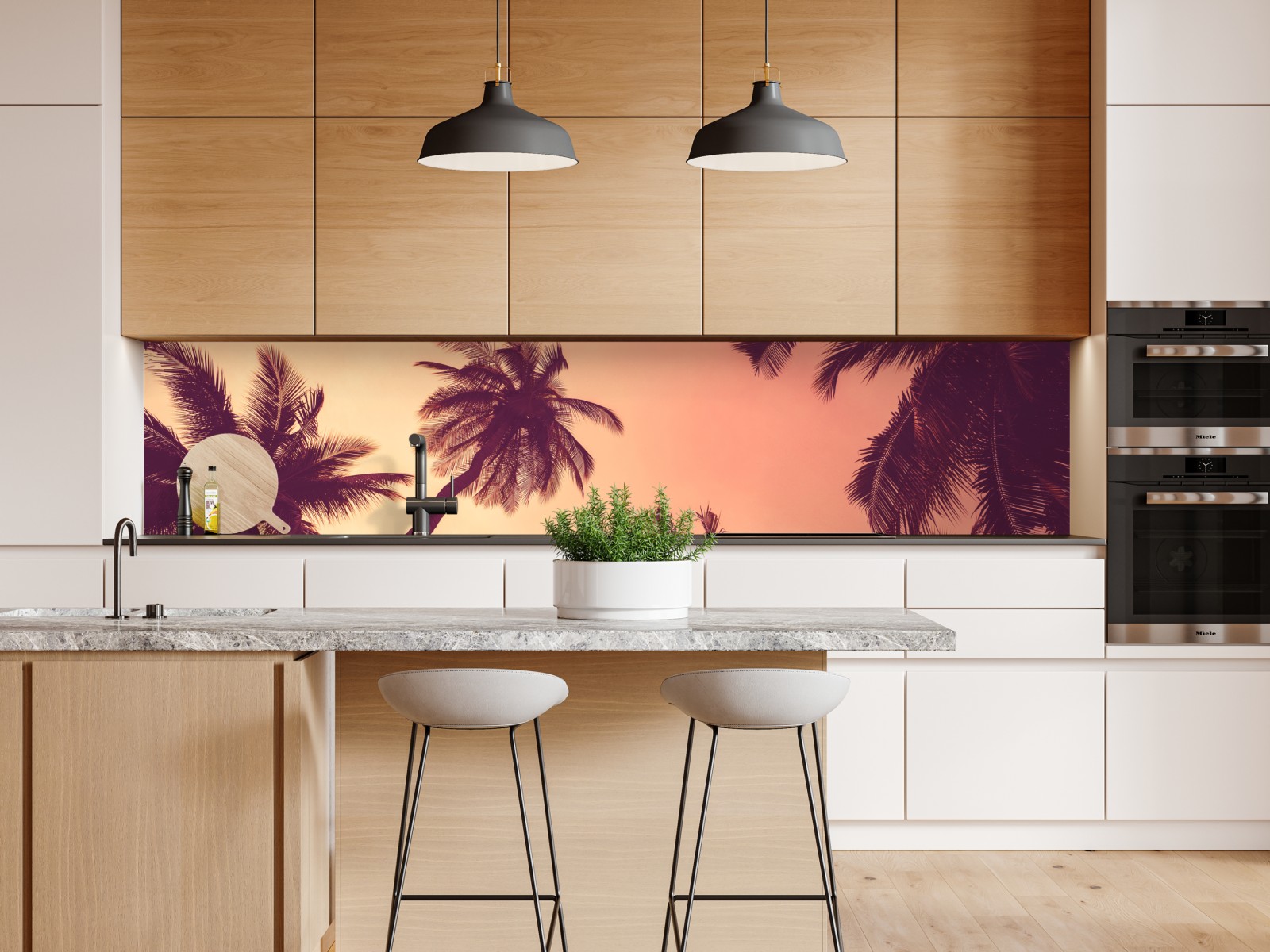 Warme, träumerische Palmensilhouetten vor rosafarbenem Himmel bringen tropische Entspannung und Urlaubsstimmung in jeden Raum.