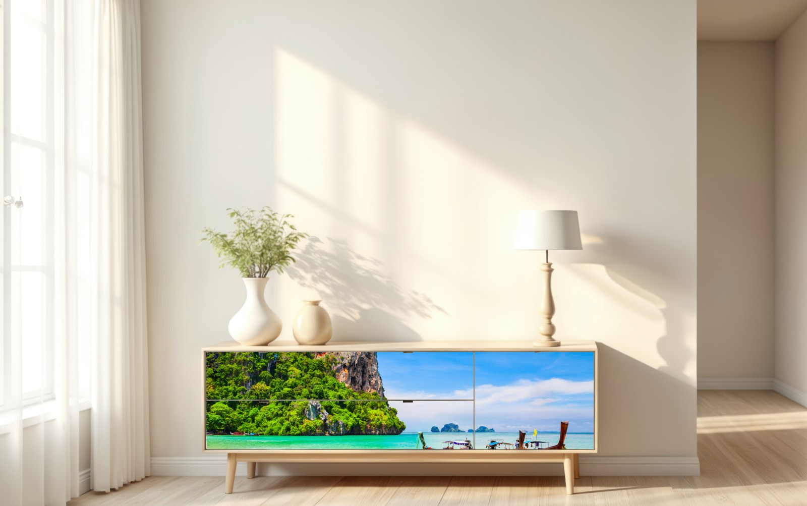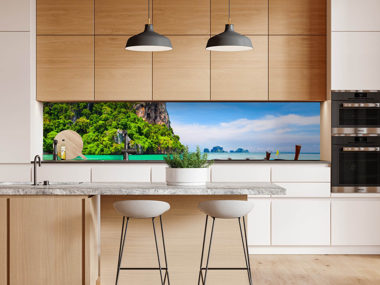 Lebendige tropische Meereslandschaft mit türkisblauem Wasser, hohen Kalksteinfelsen und traditionellen Booten, die Urlaubsstimmung in jeden Raum bringt.