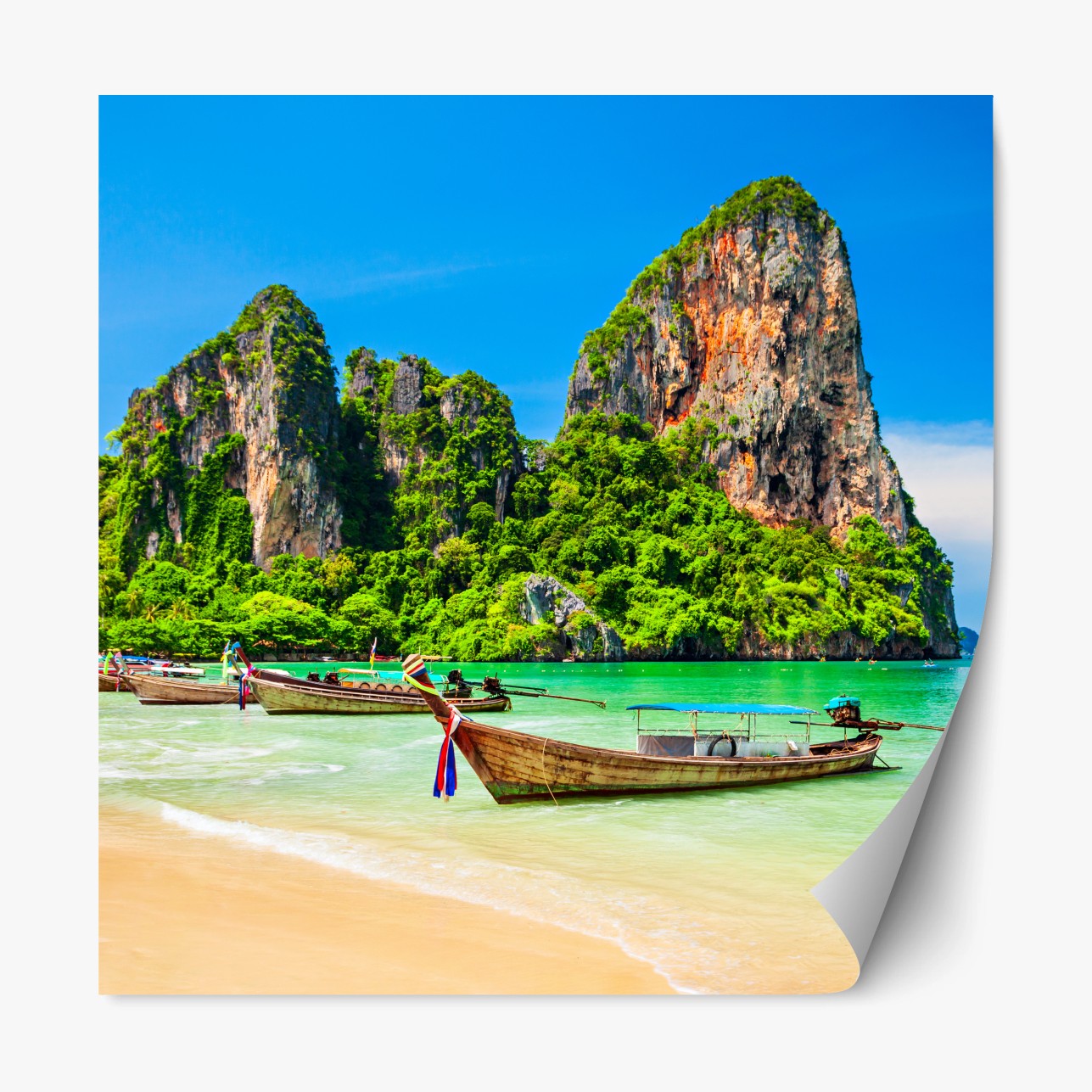 Repositionierbarer Aufkleber Longtail-boote an einem tropischen strand, Thailand