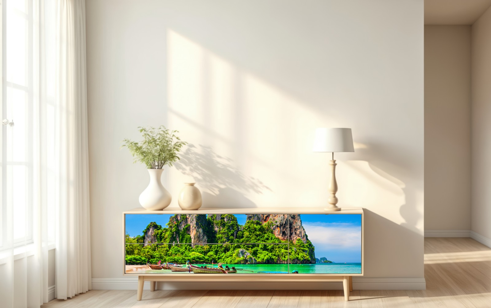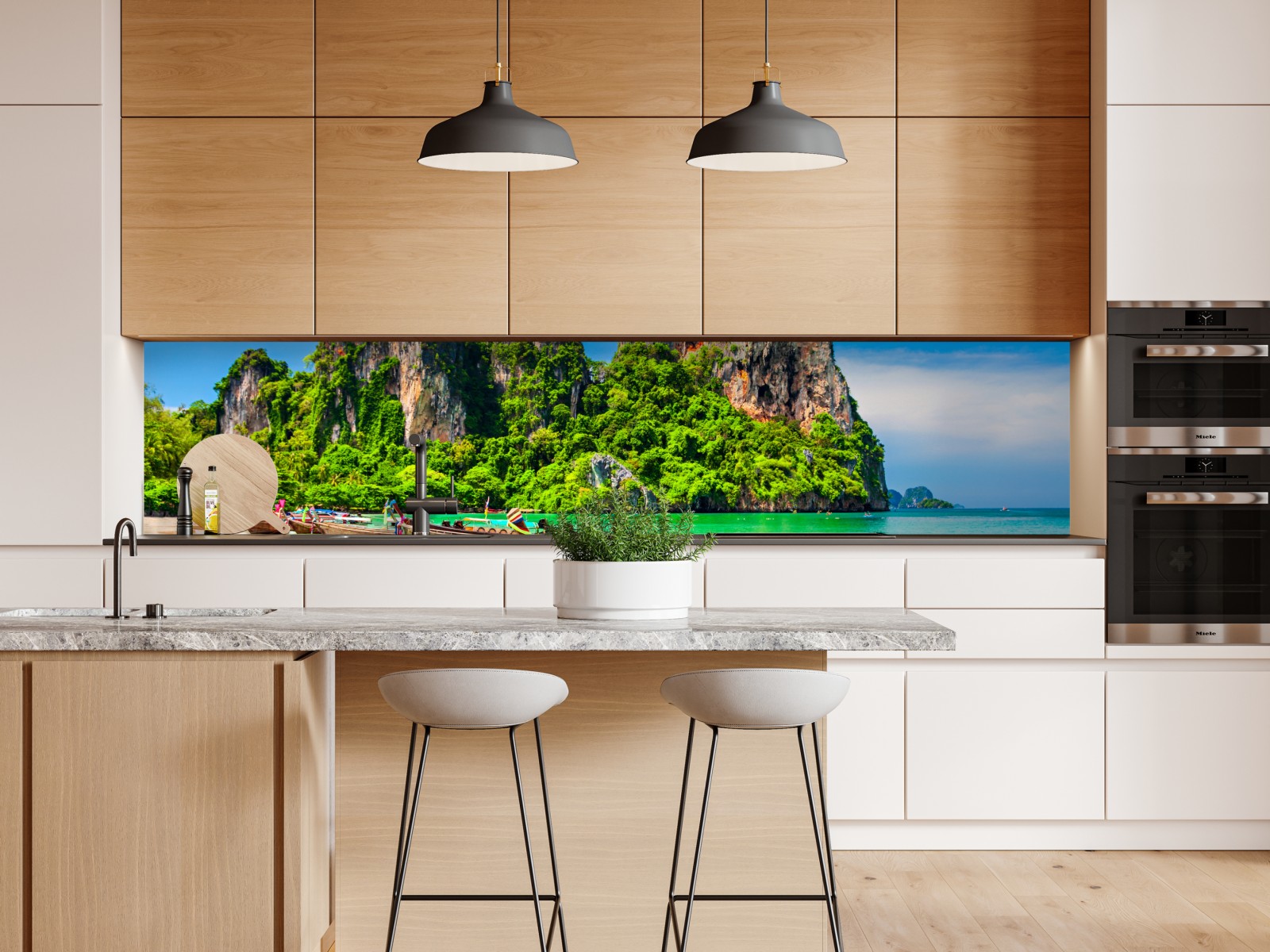 Lebendige tropische Meereslandschaft mit Longtail-Booten, türkisfarbenem Wasser und dramatischen Kalkfelsen, die Ruhe und Fernweh vermittelt.