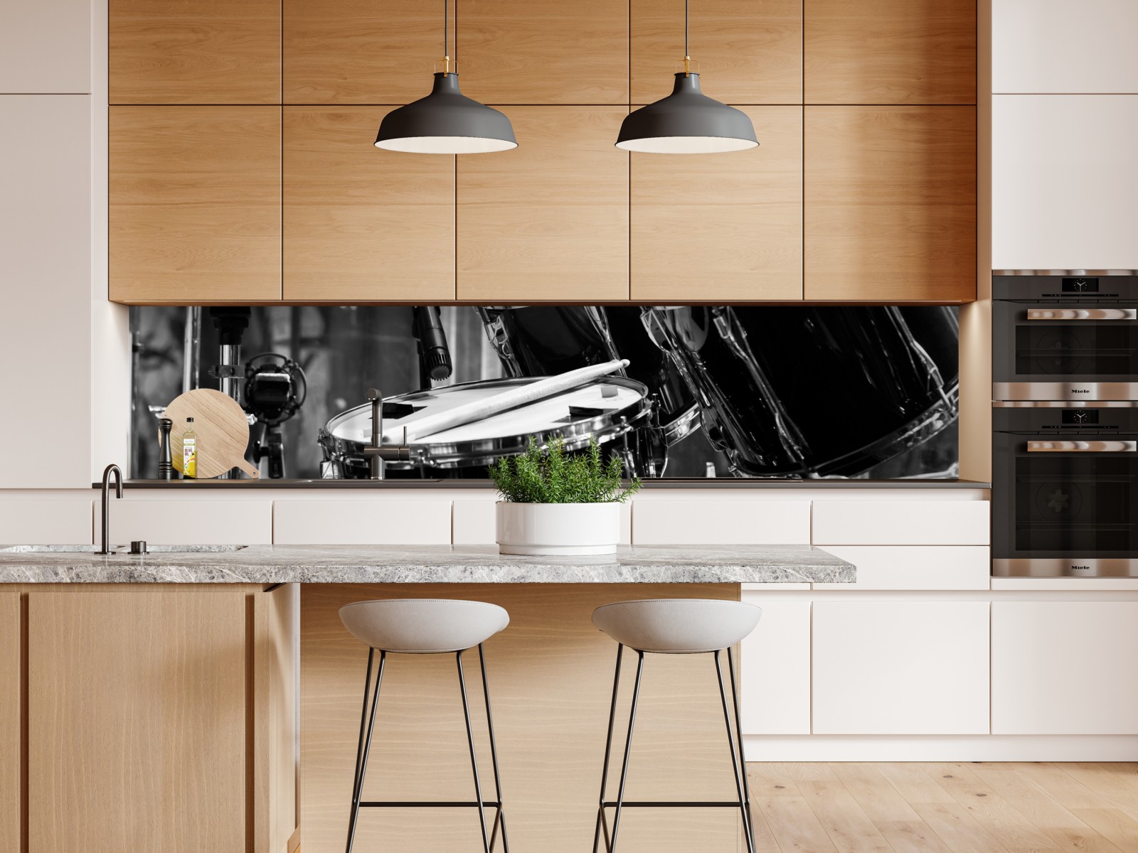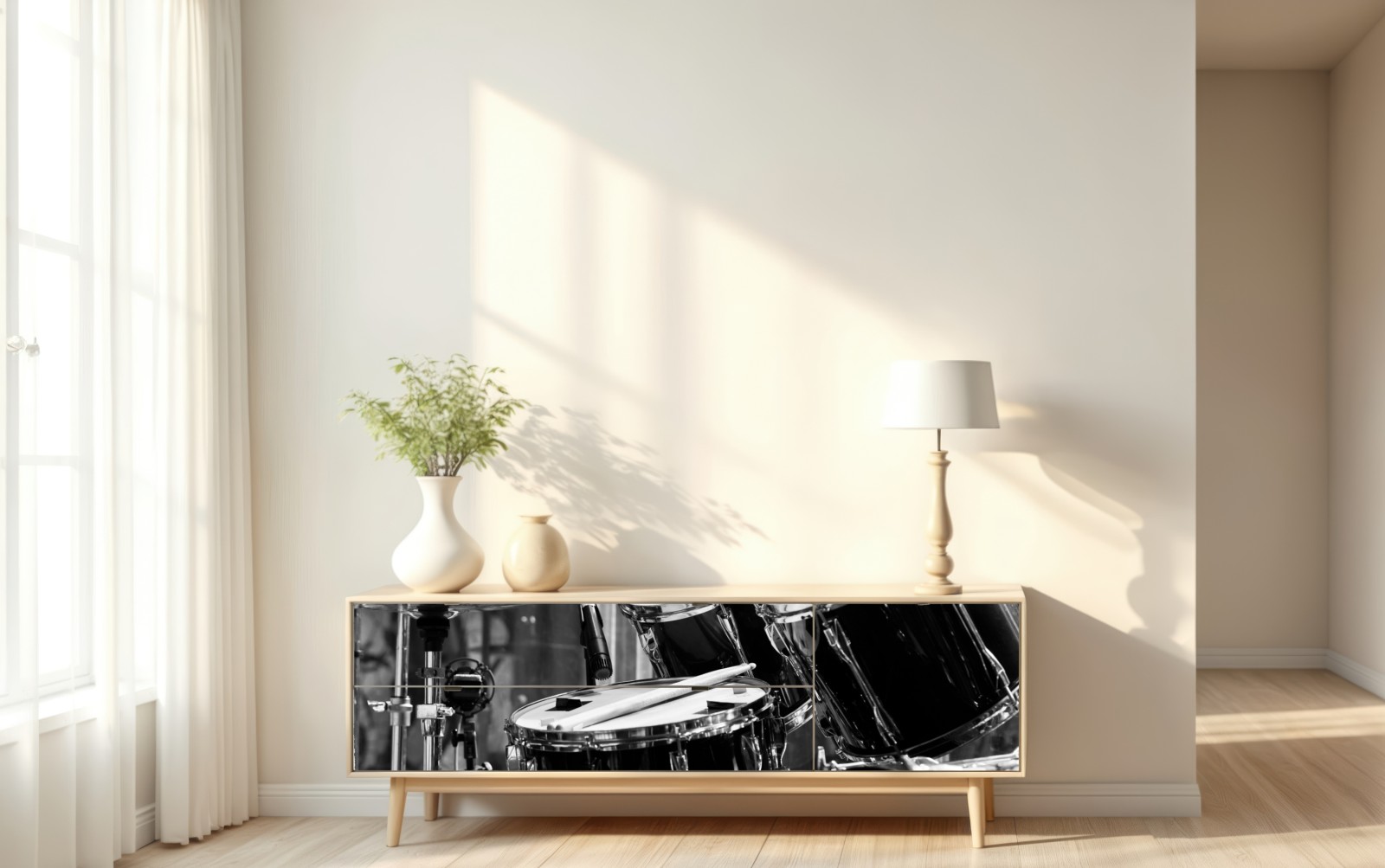 Ausdrucksstarkes Schwarzweißfoto eines Schlagzeugs, das die Energie der Livemusik und die Präzision des Studios einfängt, ideal für moderne Wohnräume.