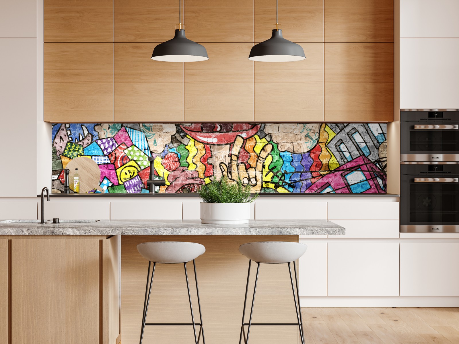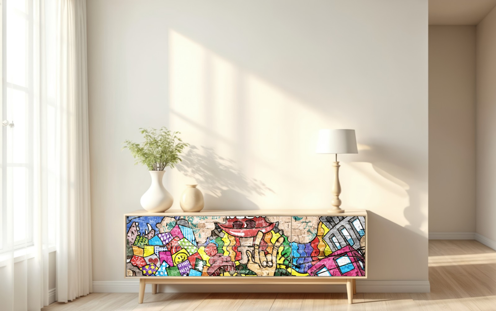 Lebendiges street-art-mural mit einer verspielten Figur, kräftigen Farben und urbaner Struktur, das jeden Raum belebt.