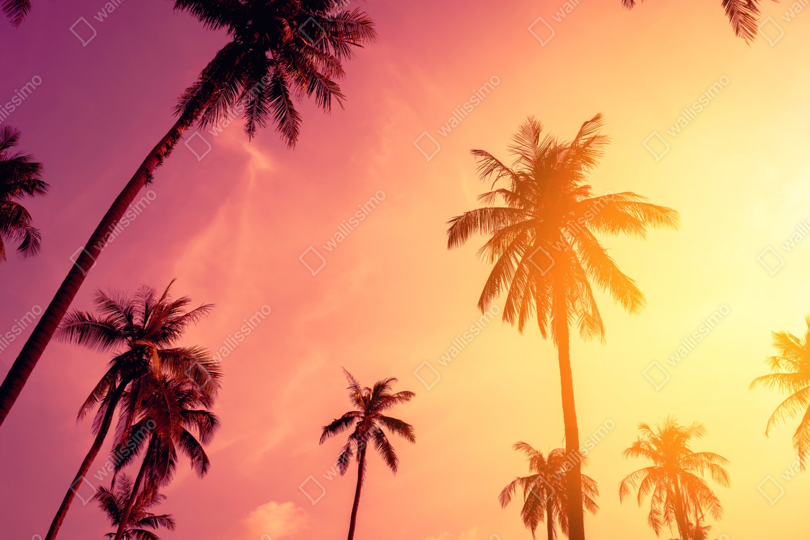 Lebendiger tropischer Sonnenuntergang mit Palmensilhouetten vermittelt warme Sommerabende und entspannte Küstenstimmung.