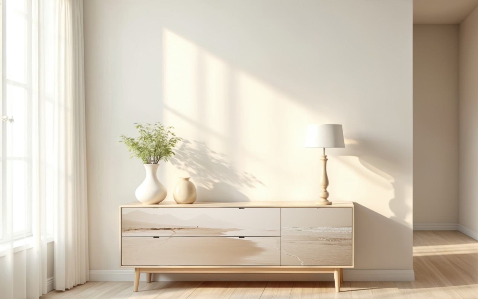 Eine minimalistische Sepiaaufnahme eines Strandes, die Wärme und Ruhe in jeden Raum bringt.