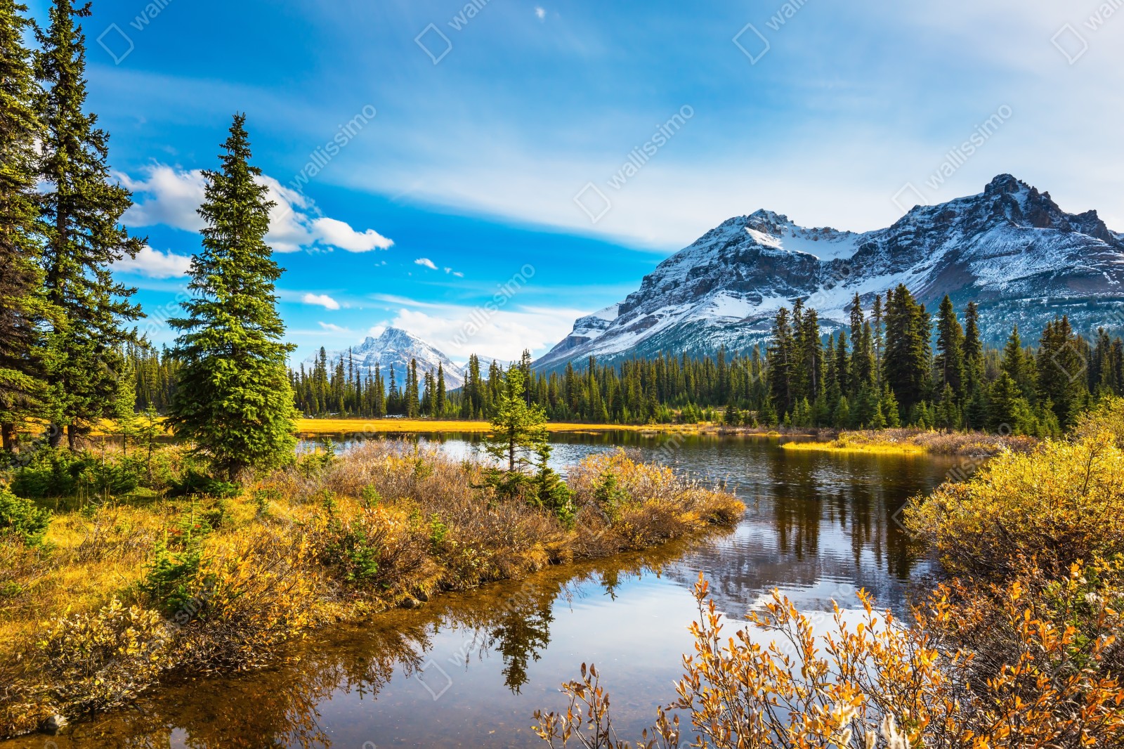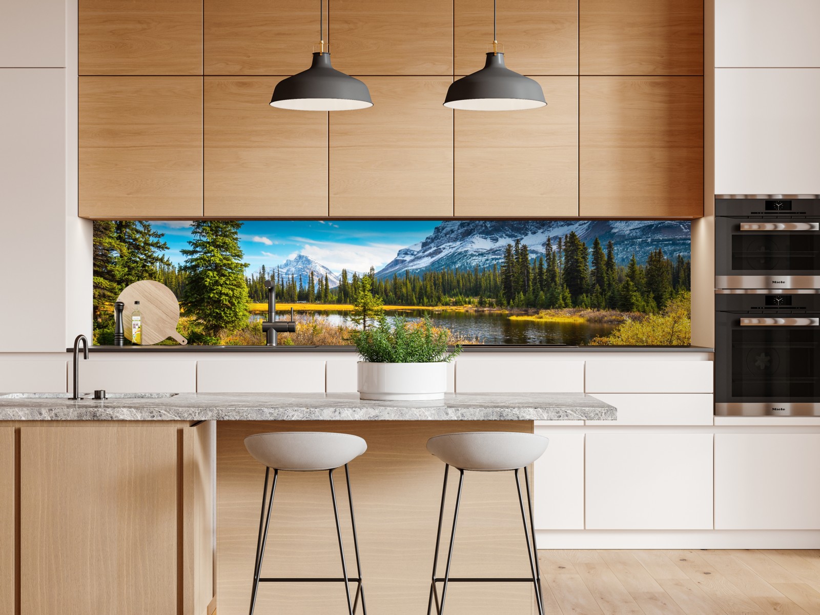 Eine ruhige Seenlandschaft mit Kiefernreflexionen und schneebedeckten Gipfeln, die natürliche Ruhe in Ihr Zuhause bringt.