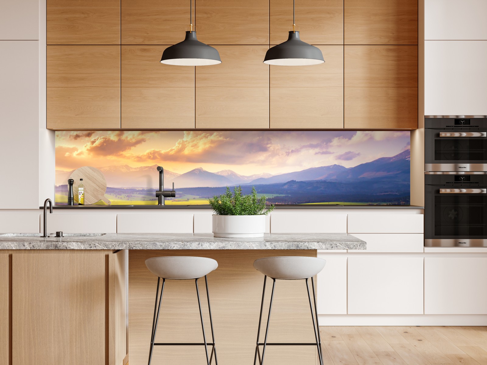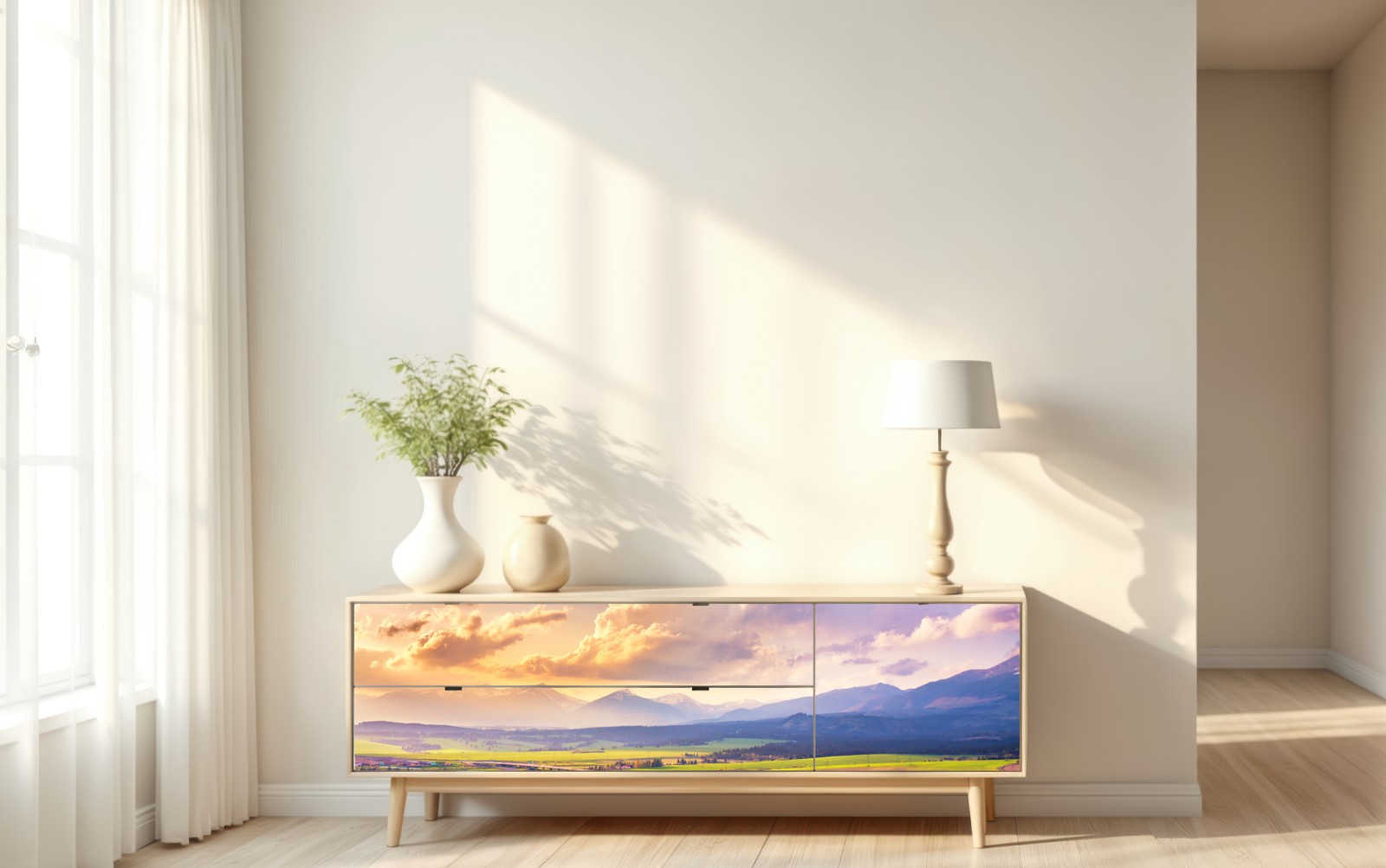 Erleben Sie die Ruhe weiter grüner Wiesen und ferner schneebedeckter Gipfel mit diesem lebendigen Panorama, das jeden Raum in eine bergige Oase verwandelt.
