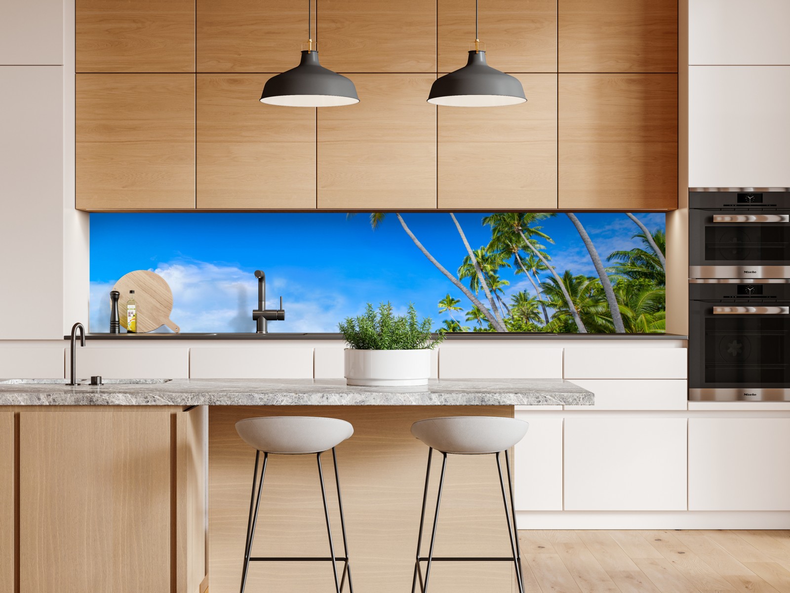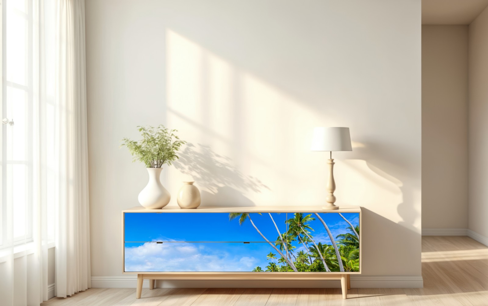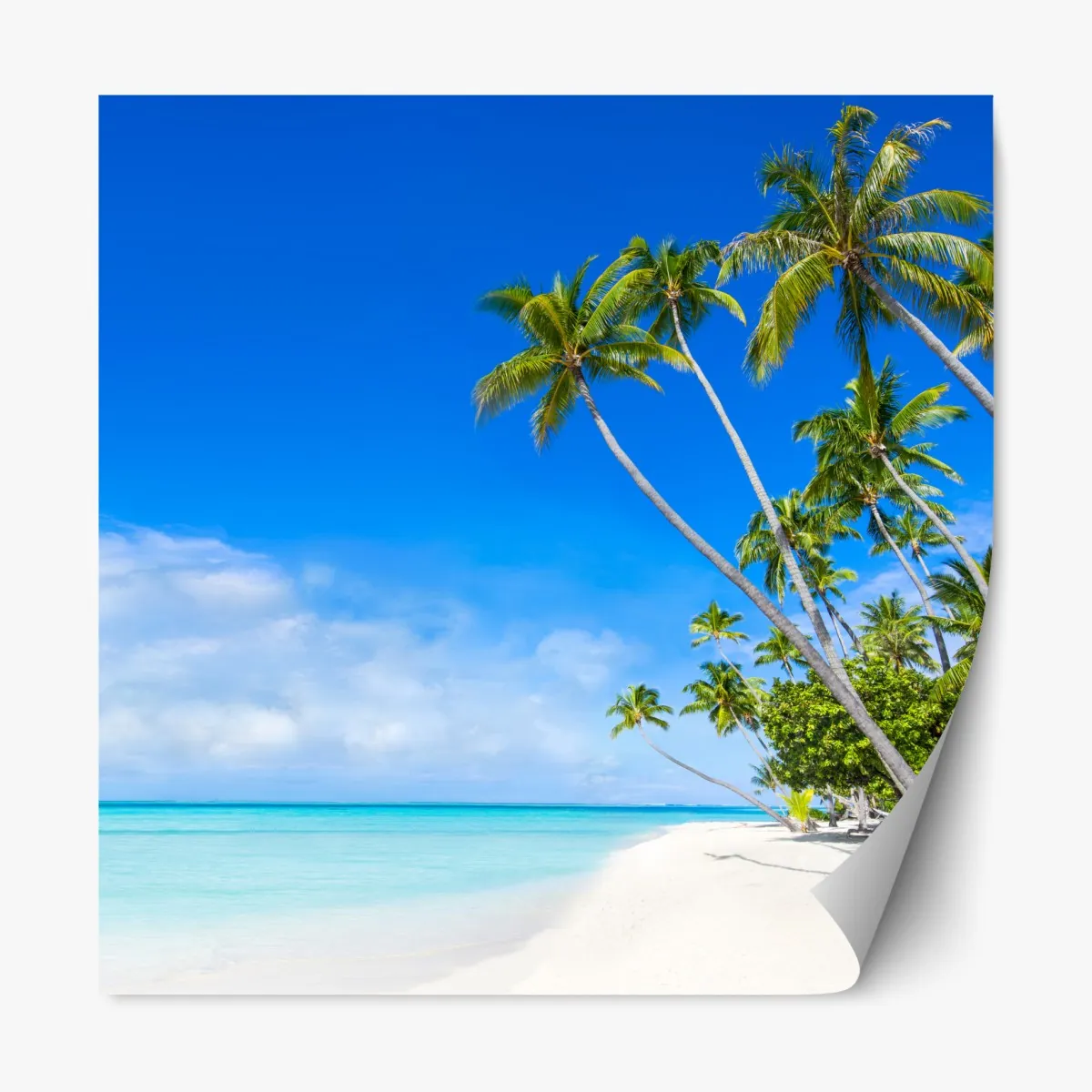Bringen Sie die beruhigende Atmosphäre eines tropischen Strandes in Ihr Zuhause mit türkisfarbenem Wasser, wiegenden Palmen und makellosem weißem Sand.