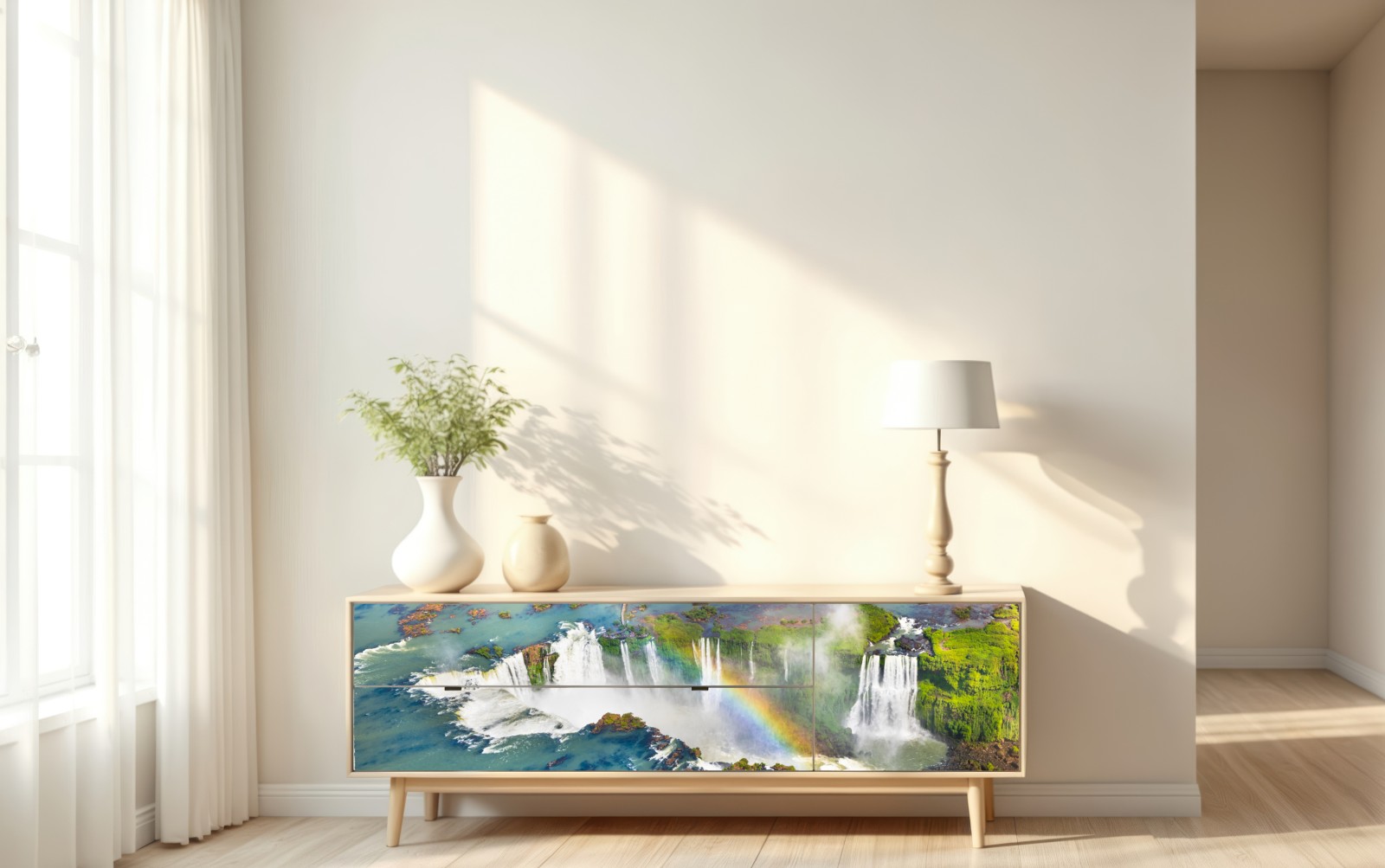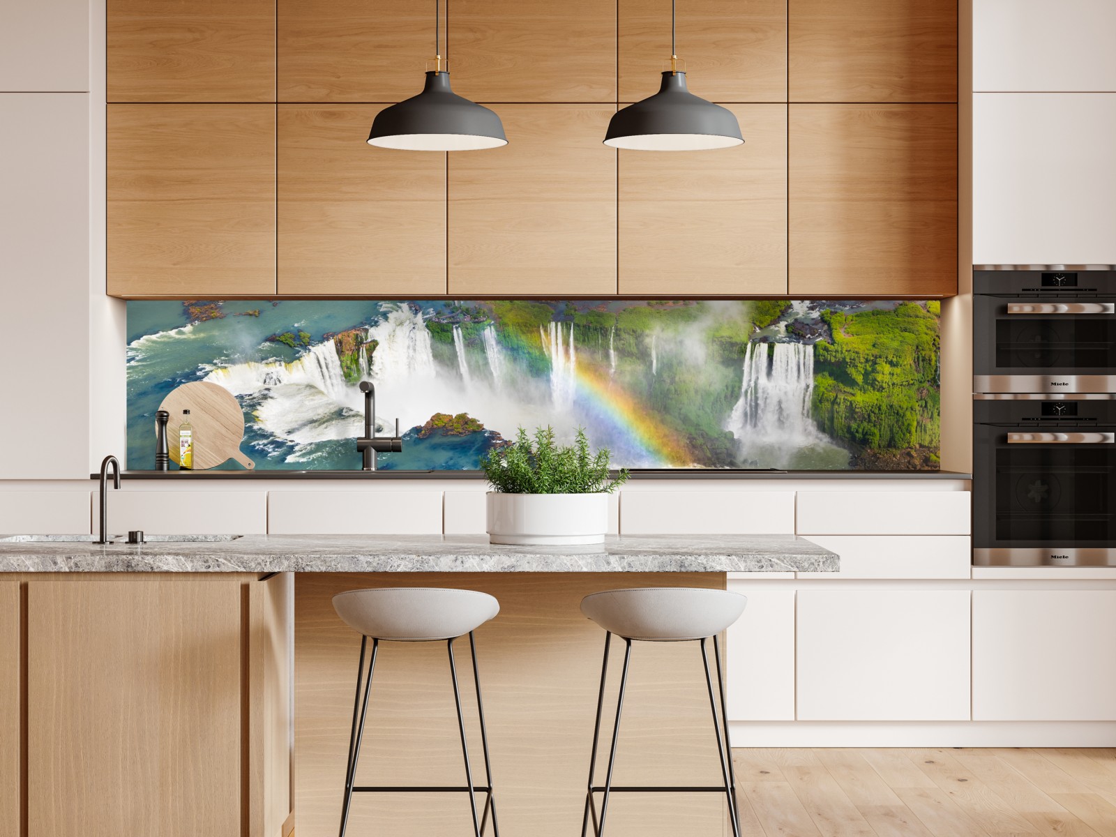 Atemberaubende Luftaufnahme eines stürzenden Wasserfalls mit einem farbintensiven Regenbogen über üppigen grünen Inseln, die natürliche Ruhe und dramatische Schönheit in jeden Raum bringt.
