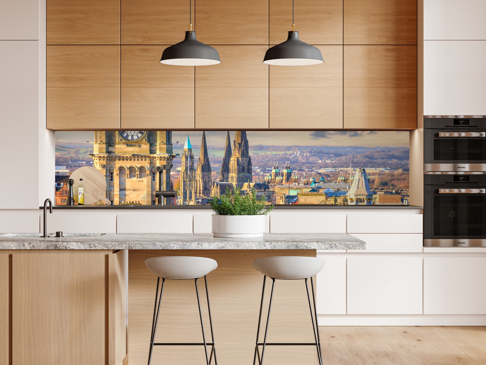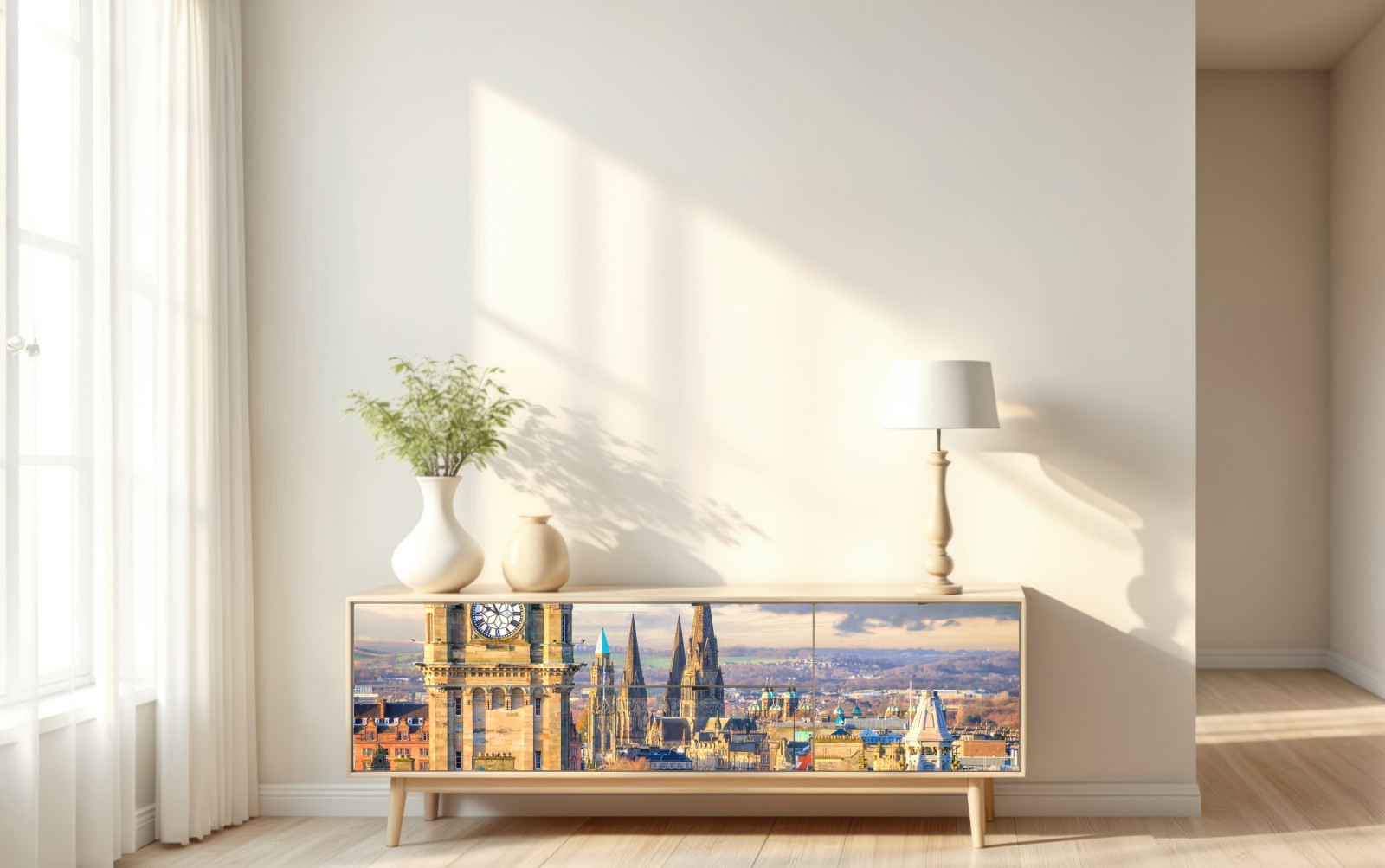 Lebhafte Panoramaaufnahme der Altstadt von Edinburgh mit dem markanten Schloss und Uhrturm, ideal zur Verschönerung von Wohnräumen.