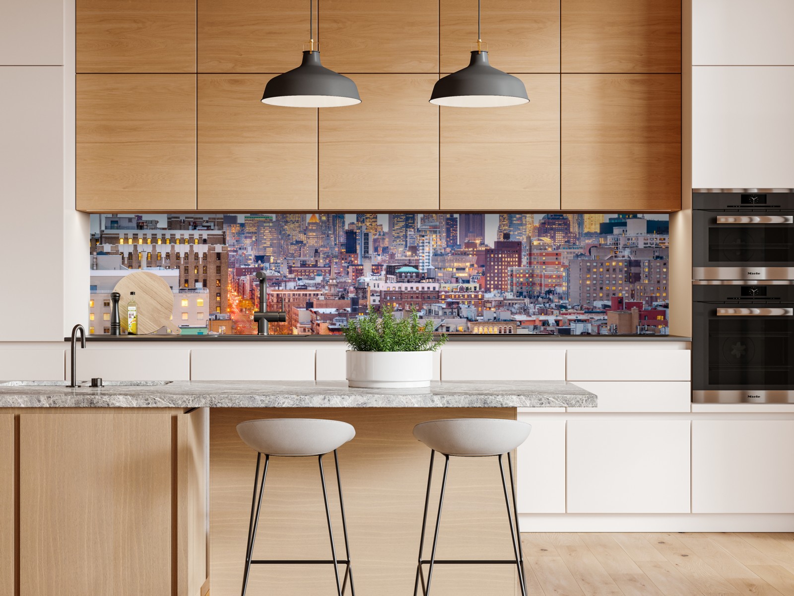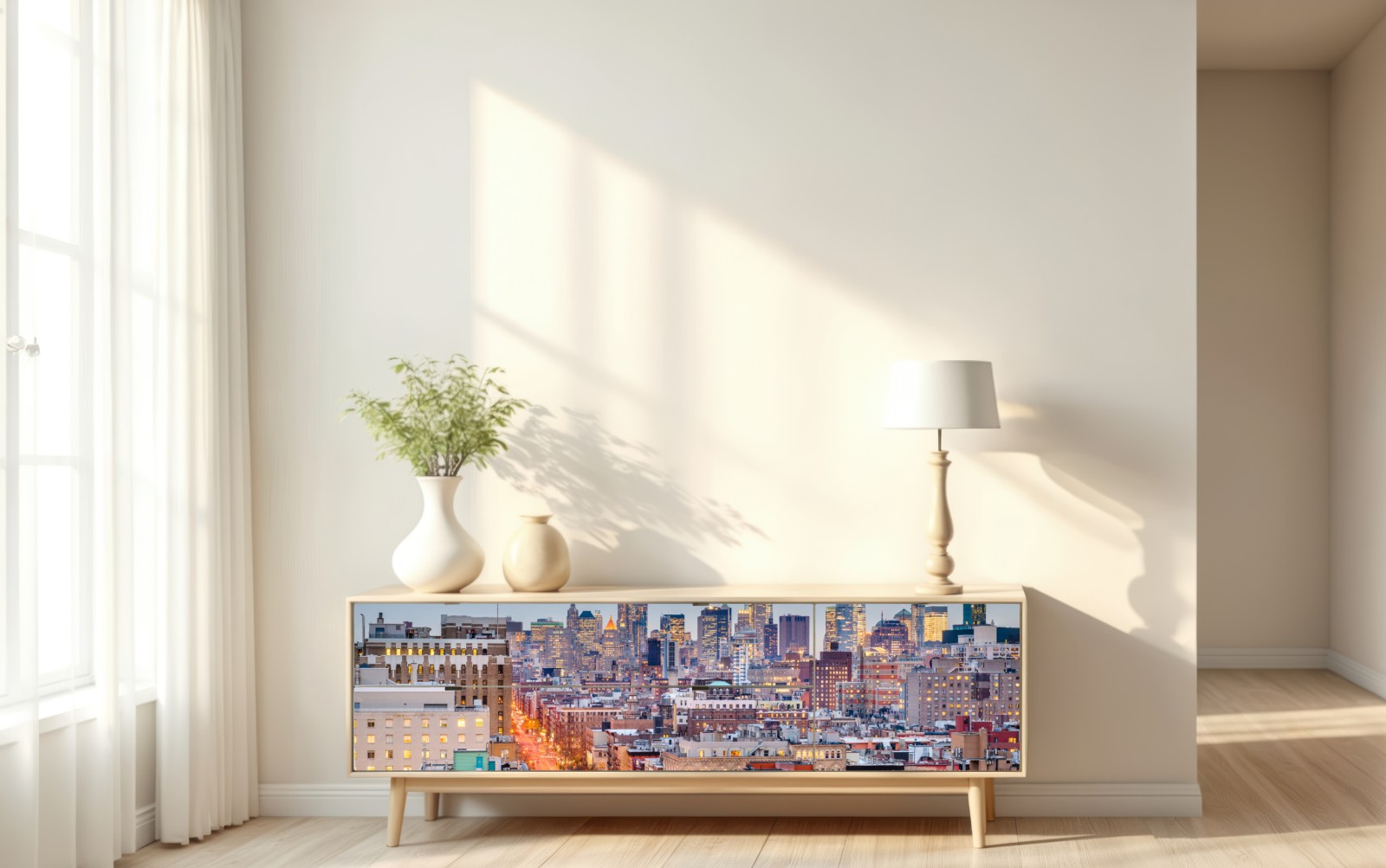 Atemberaubender Blick auf die Skyline von New York bei Dämmerung mit funkelnden Stadtlichtern, ideal zur Verschönerung moderner Räume.