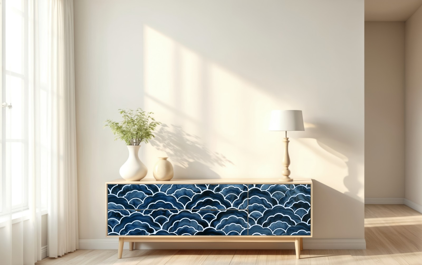 Elegantes japanisches seigaiha-Wellenmuster in tiefen indigotönen, perfekt, um jedem interieur eine ruhige, kulturelle note zu verleihen.