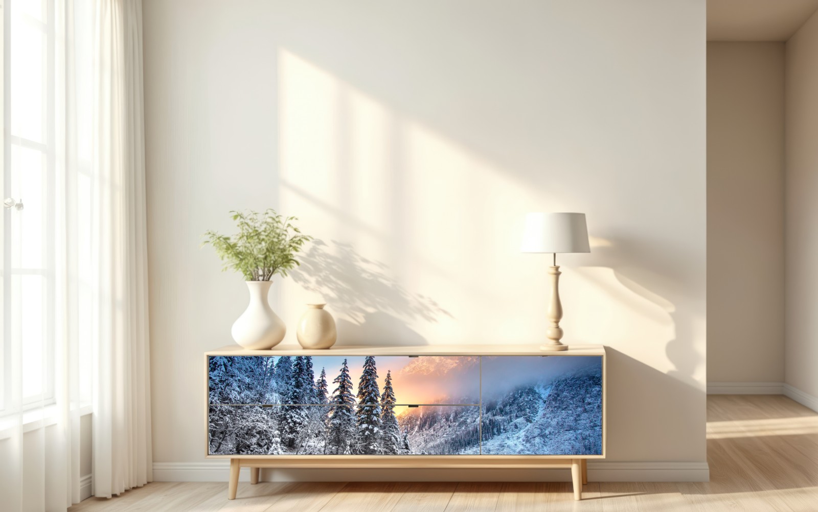 Bringen Sie die ruhige Schönheit eines Wintersonnenaufgangs in Ihr Zuhause mit dieser verschneiten Berg- und Seeszene, die jedem Raum Ruhe und natürliches Licht verleiht.