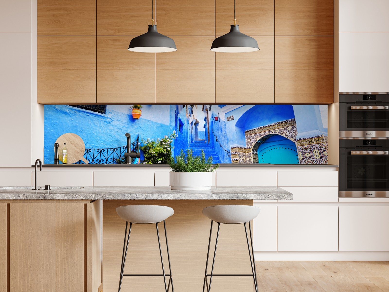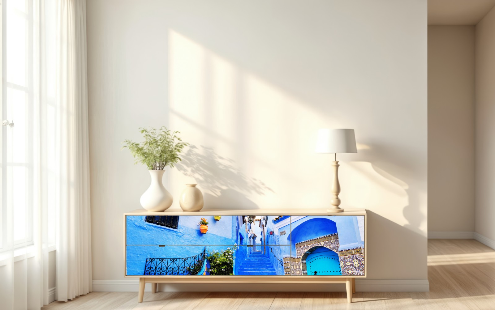 Lebhafte blaue Medina-Gasse mit Mosaikfliesen und bunten Töpfen, die jedem Raum eine reisefreudige Atmosphäre verleiht.