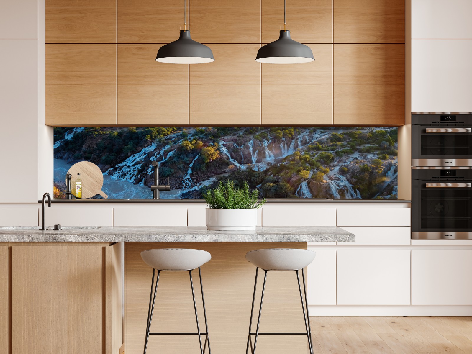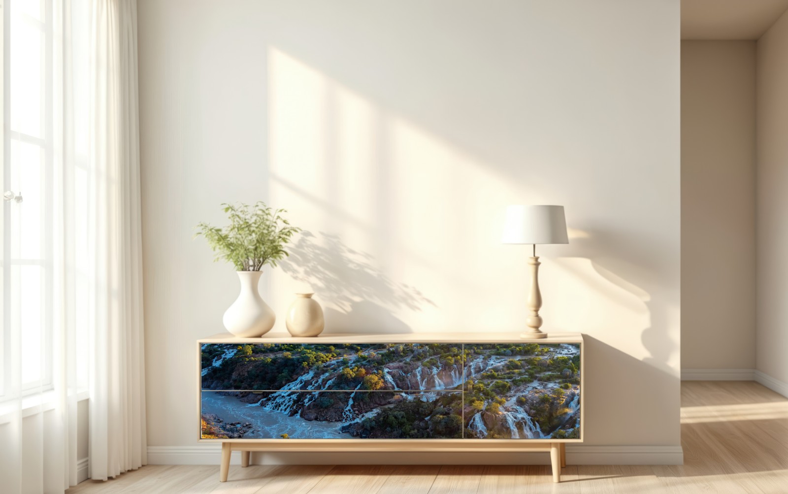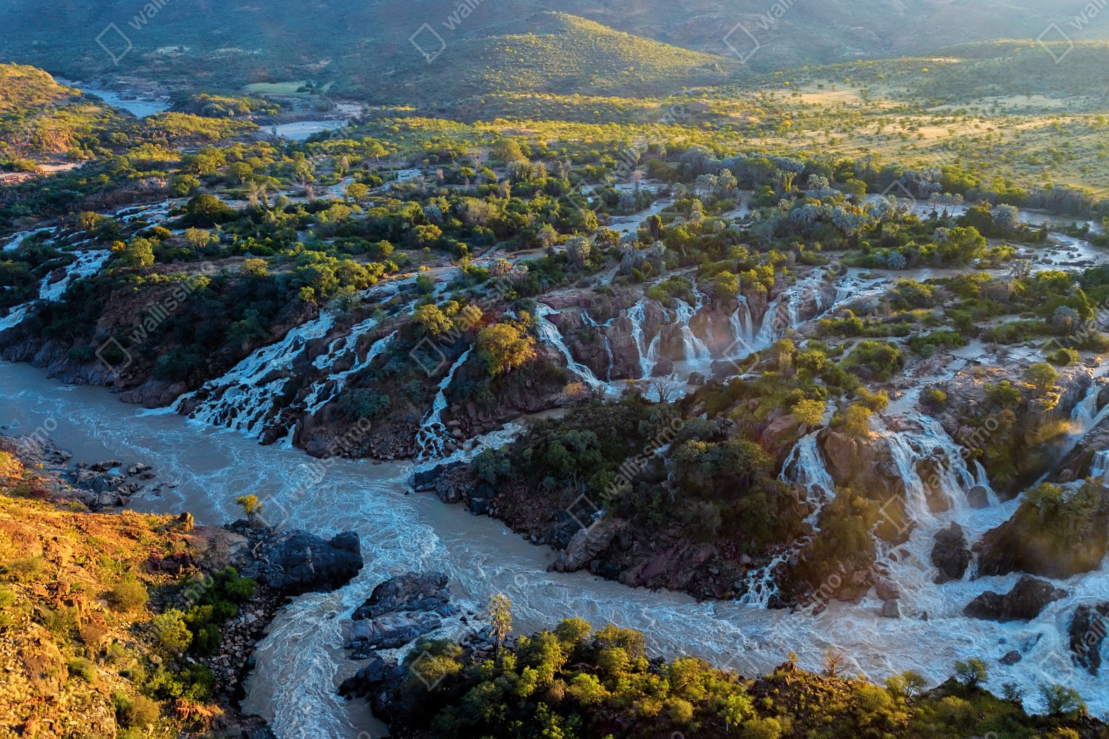 Atemberaubender Blick auf die Epupa Falls bei Sonnenaufgang mit nebligen Kaskaden und goldenem Licht, der eine ruhige, natürliche Panoramaatmosphäre schafft und jedem Raum Ruhe und Abenteuer verleiht.