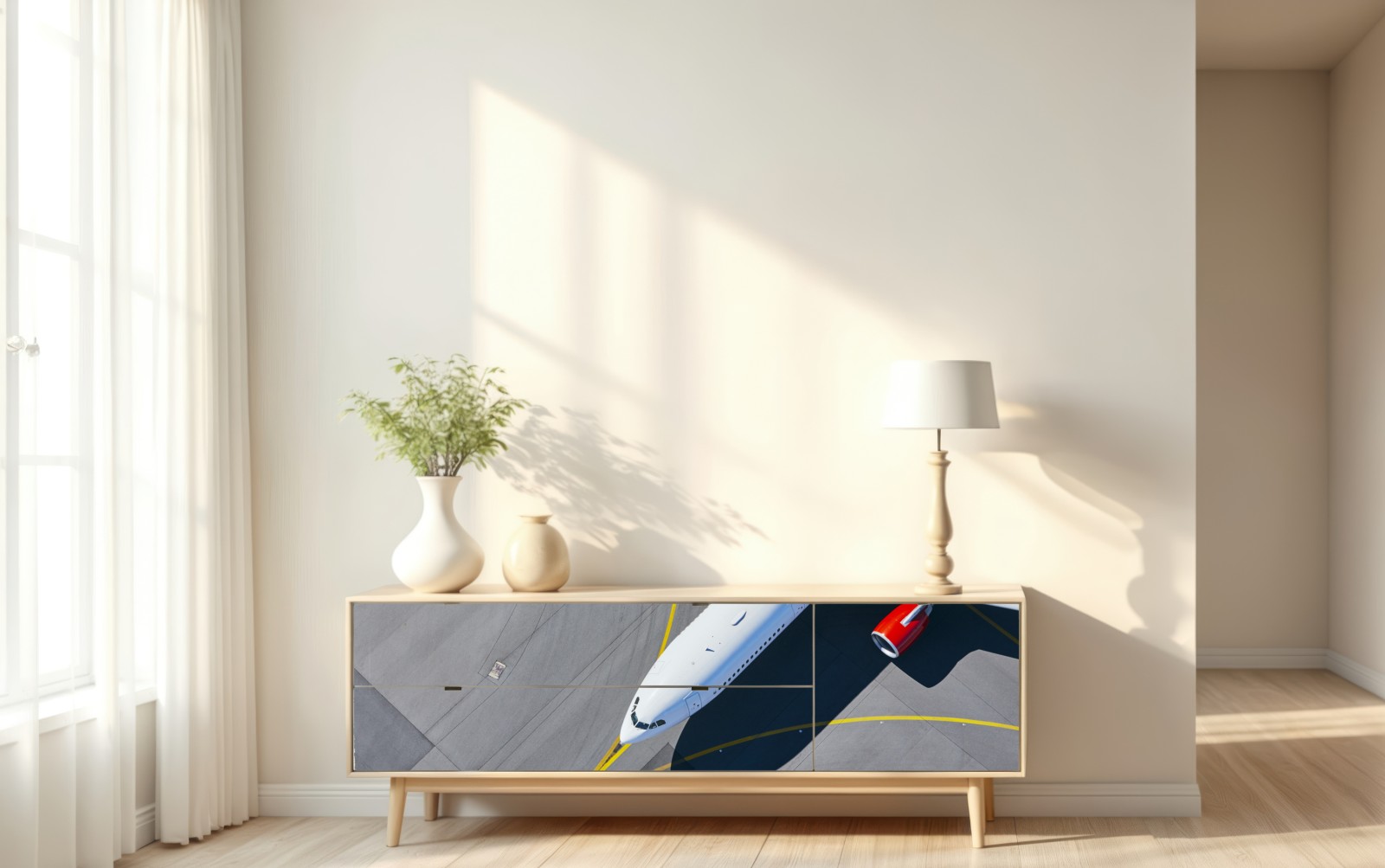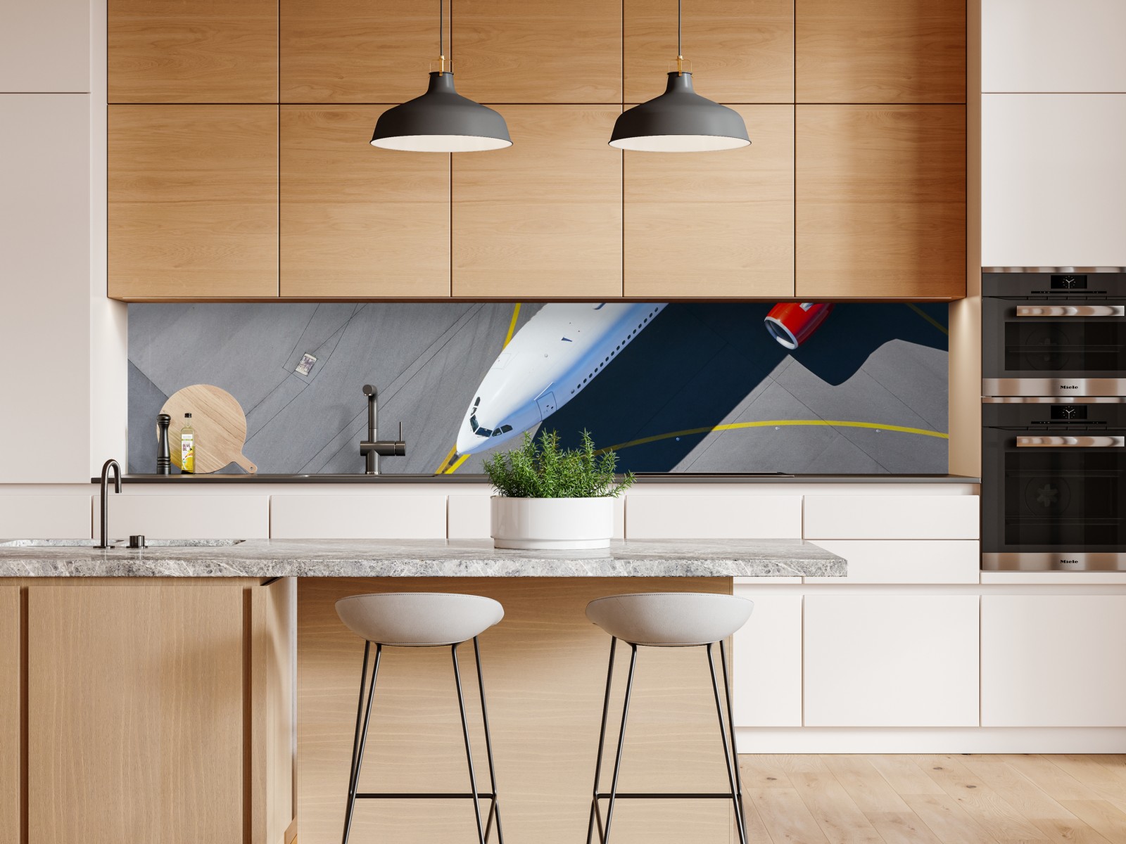 Dynamische Luftaufnahme eines Passagierflugzeugs auf dem Rollfeld, ideal als modernes Wandbild für Büro oder Wohnzimmer.