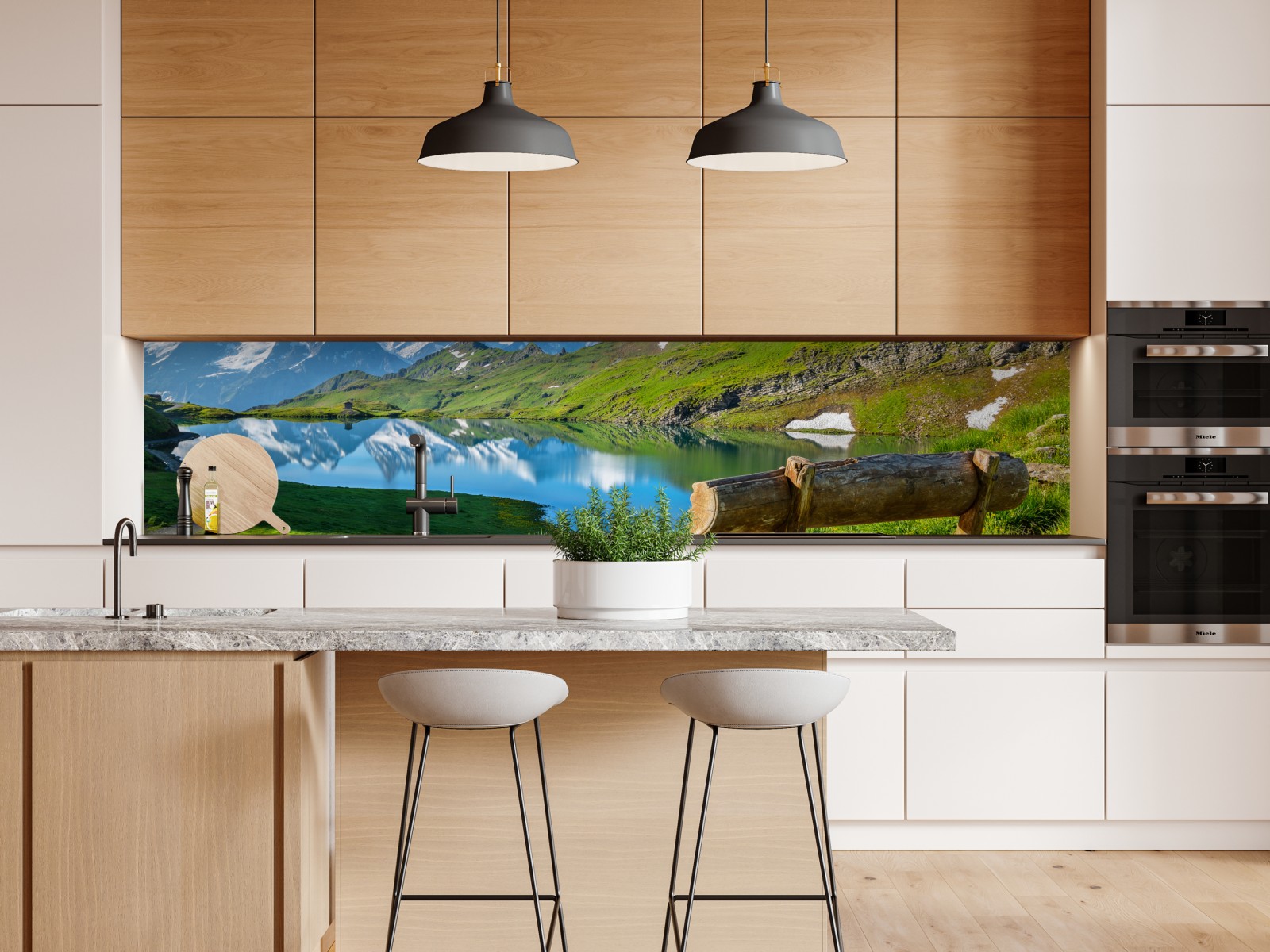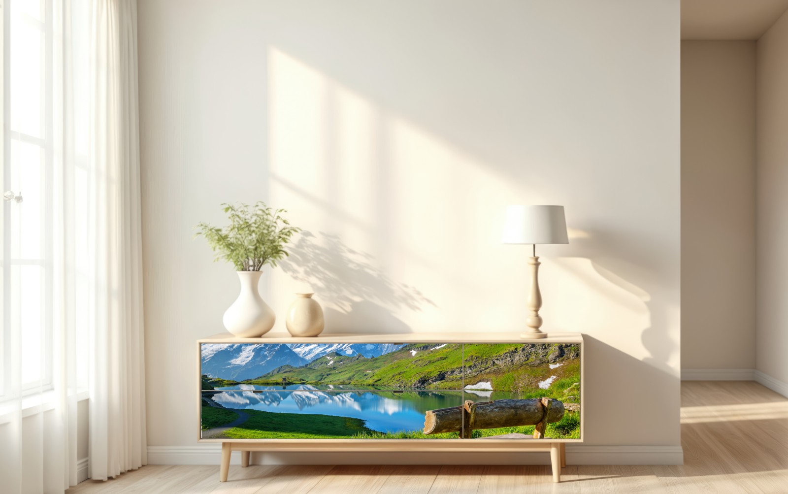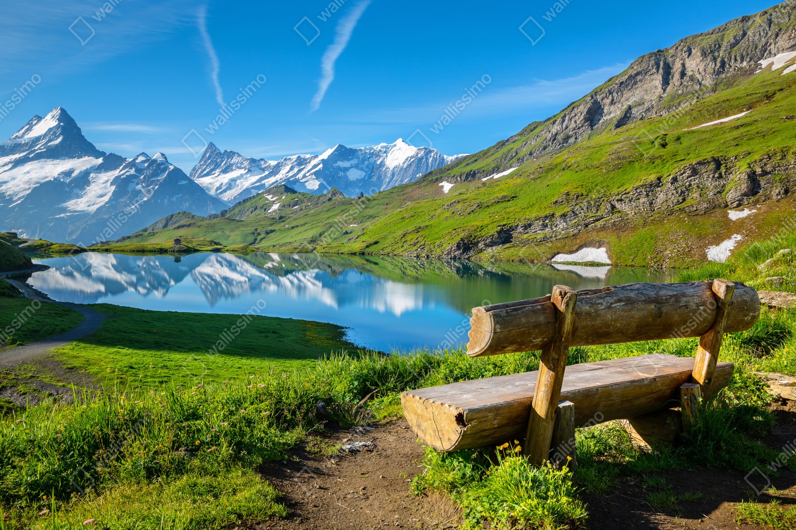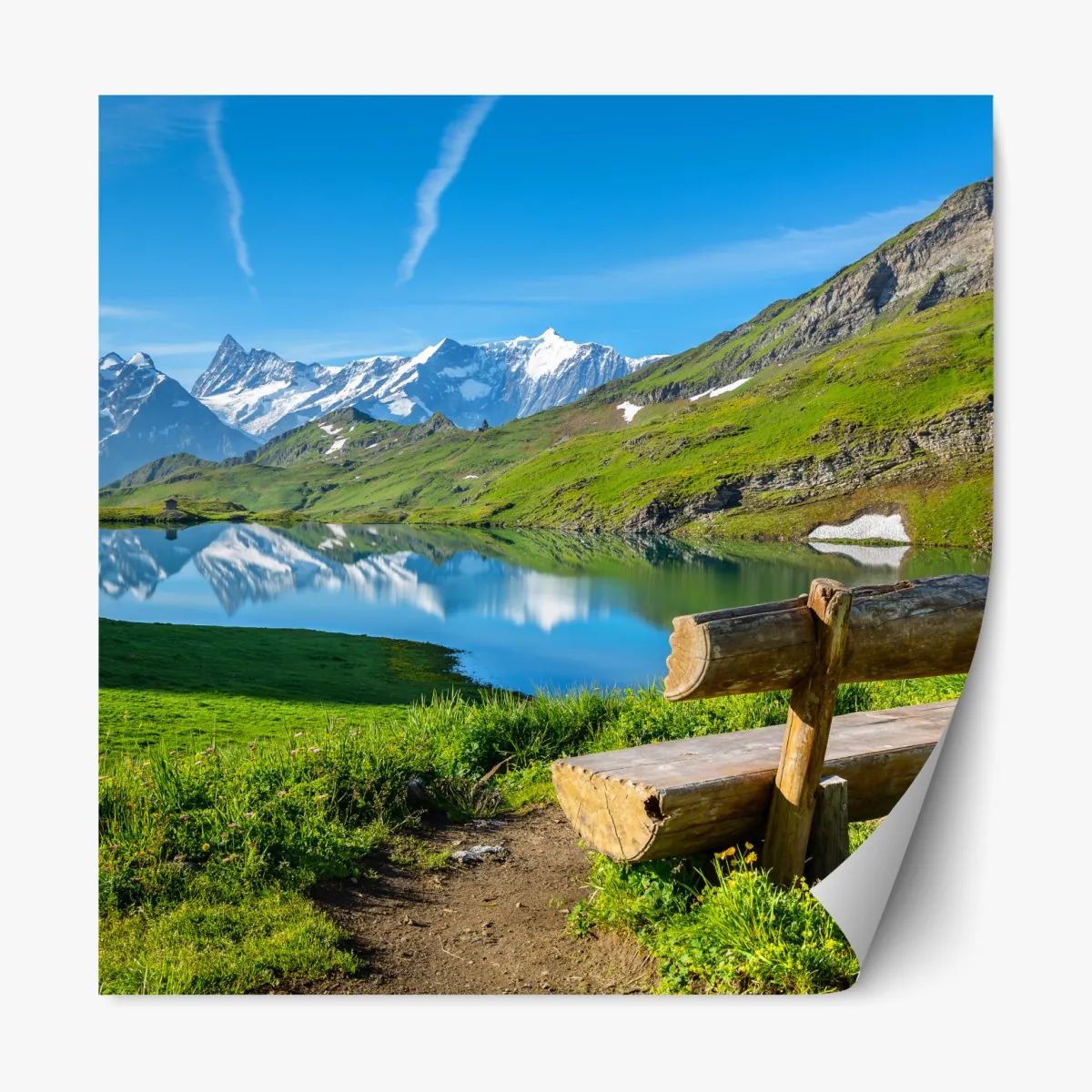 Eine friedliche Alpenlandschaft mit einer hölzernen Bank an einem spiegelnden Bergsee, ideal, um Ruhe in jeden Raum zu bringen.