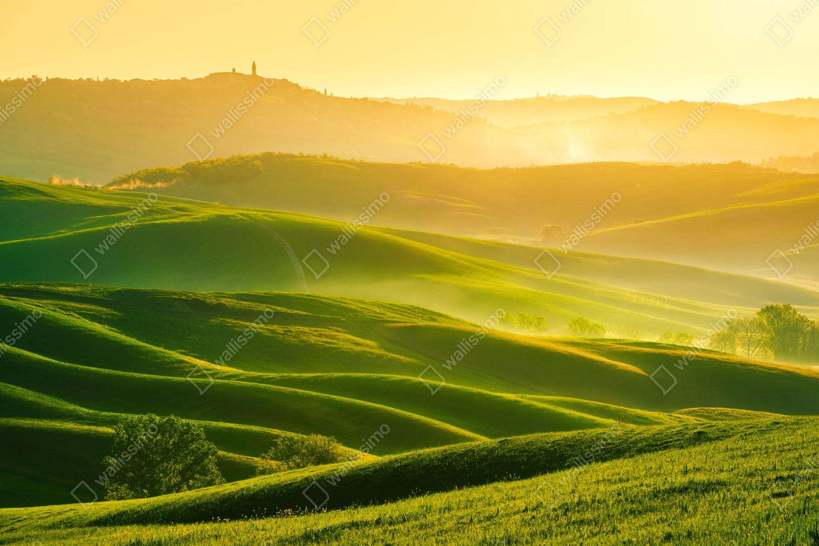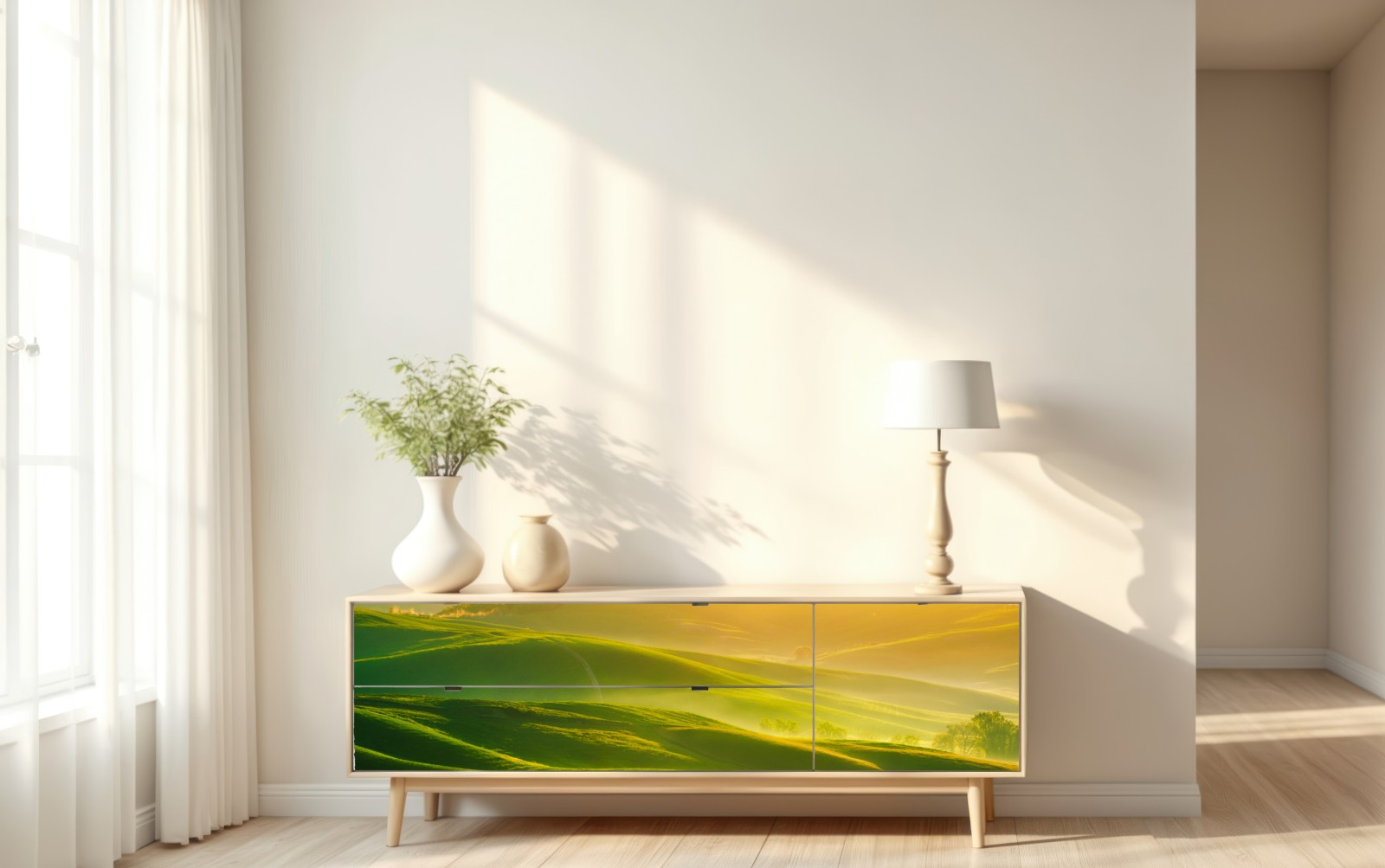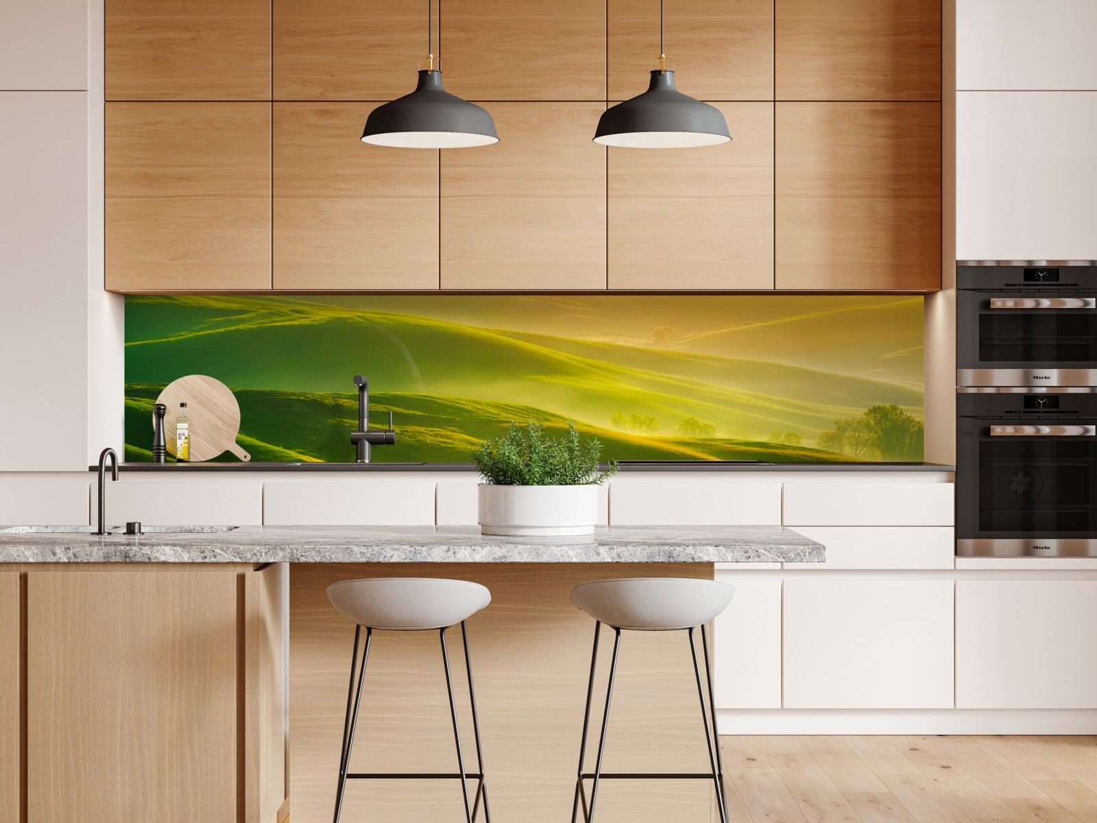 Bringen Sie die Ruhe der Landschaft in Ihr Zuhause mit diesem Panoramablick auf sanfte grüne Hügel im warmen goldenen Licht.