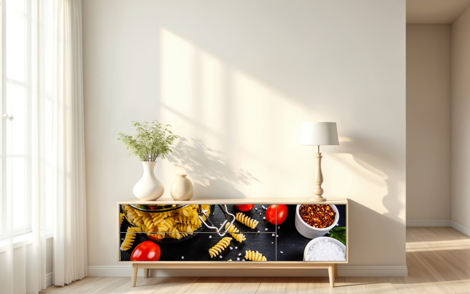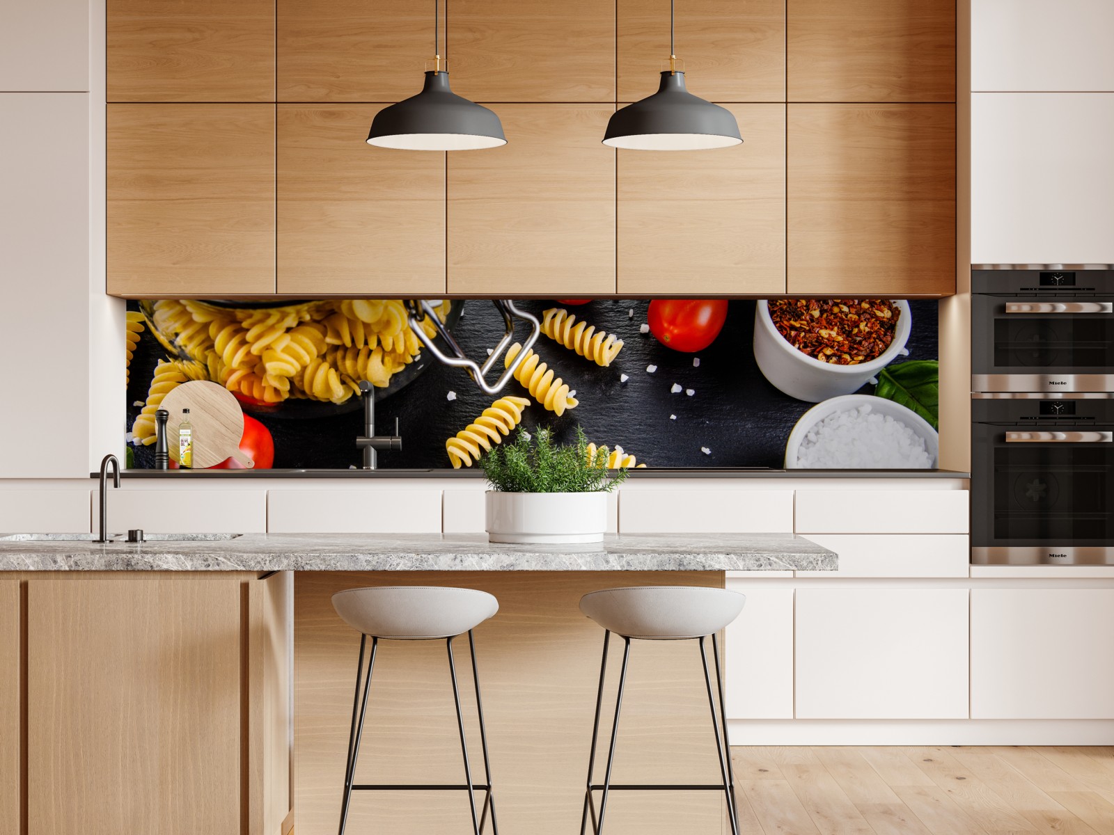 Lebhafte Food-Fotografie mit rohen Nudeln, Cherrytomaten, Basilikum und Gewürzen, perfekte Küchenwanddekoration, die kulinarische Inspiration vermittelt.