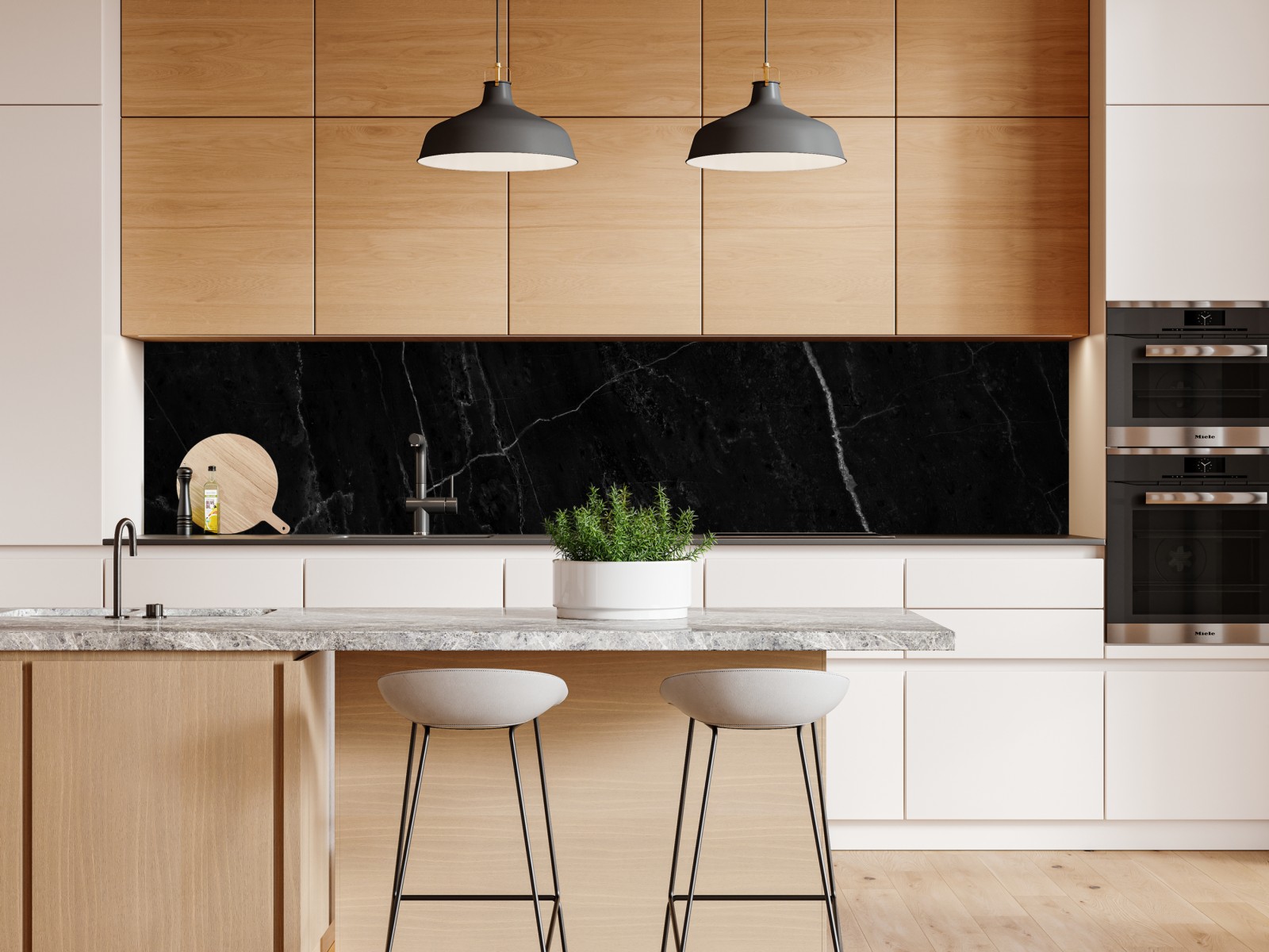 Elegante schwarze Marmorstruktur mit markanten weißen Adern, die Innenräumen einen luxuriösen, modernen Akzent verleiht.