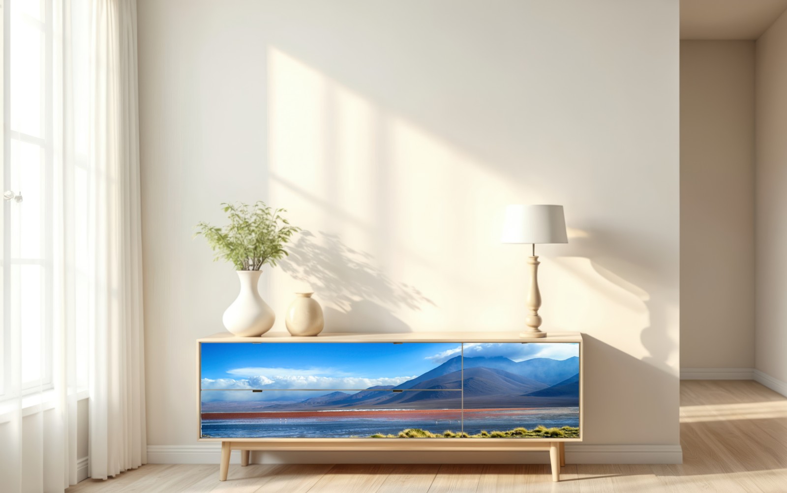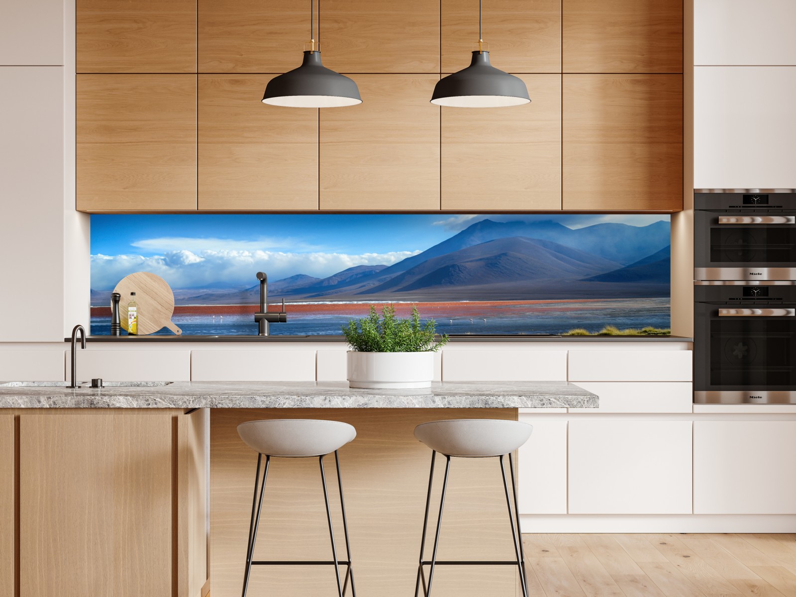 Lebendige Berglagune unter tiefblauem Himmel mit sanften Hügeln und grasigem Vordergrund, ideal um ruhige natürliche Atmosphäre in Innenräume zu bringen.