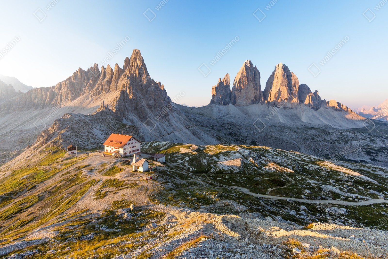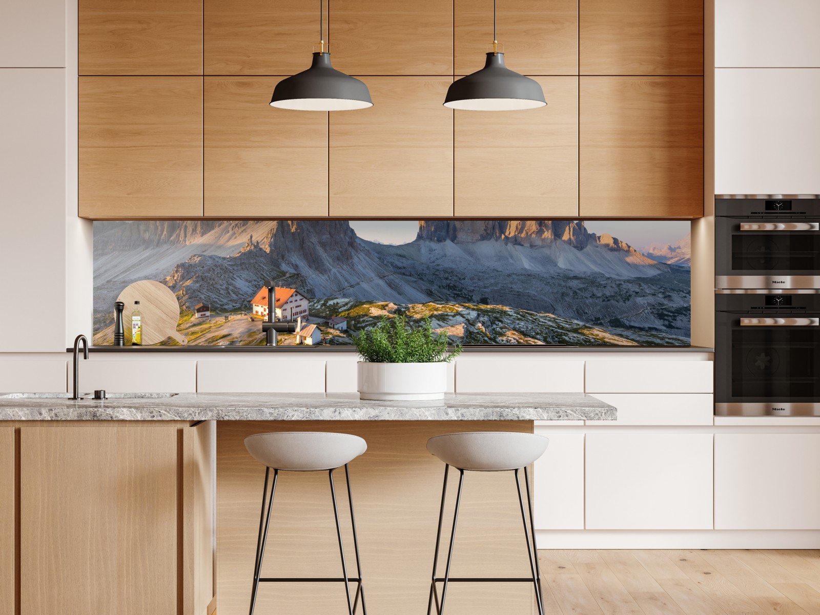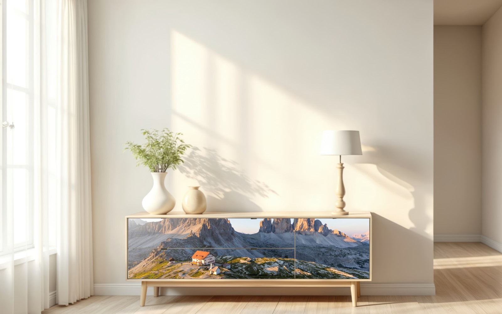 Ein beeindruckendes Panorama alpiner Gipfel mit einer gemütlichen Berghütte im goldenen Morgenlicht, ideal um die Ruhe der Natur ins Zuhause zu bringen.