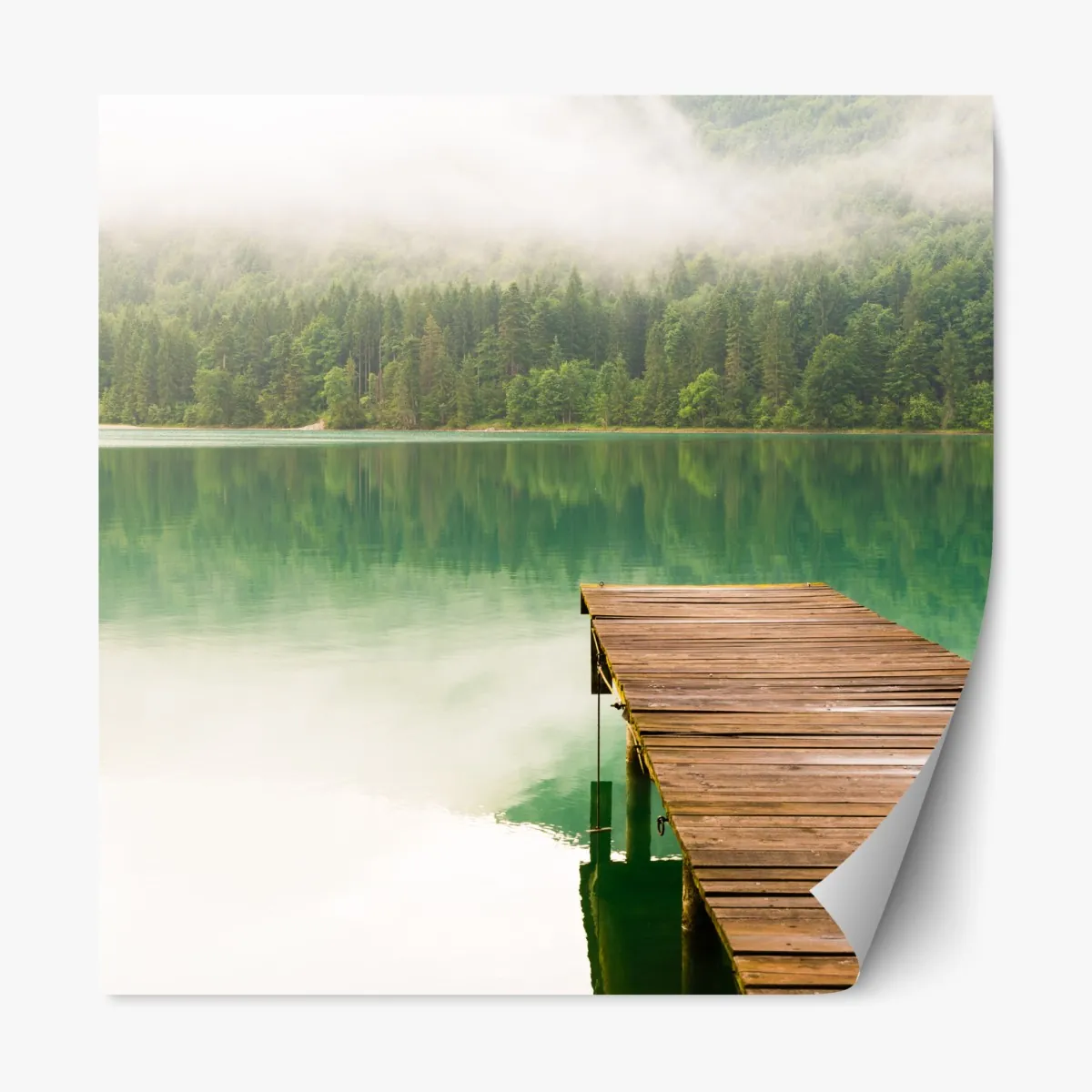 Repositionierbarer Aufkleber nebliger see mit hölzernem steg