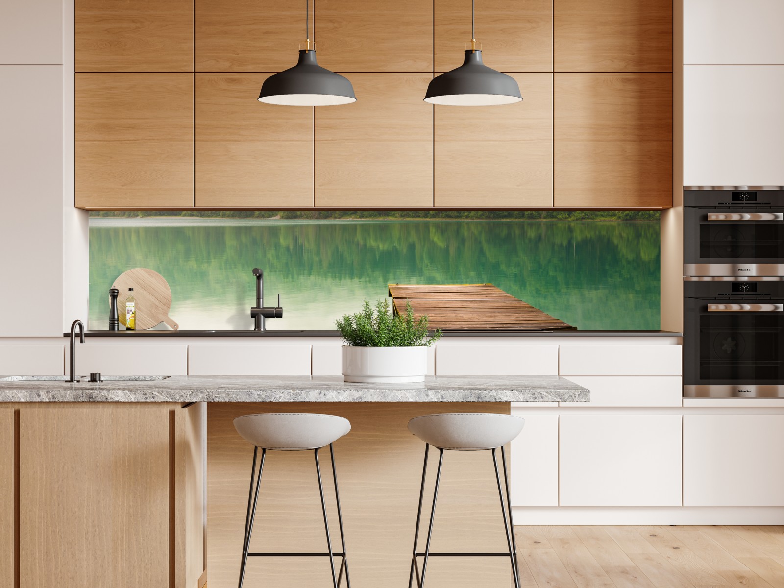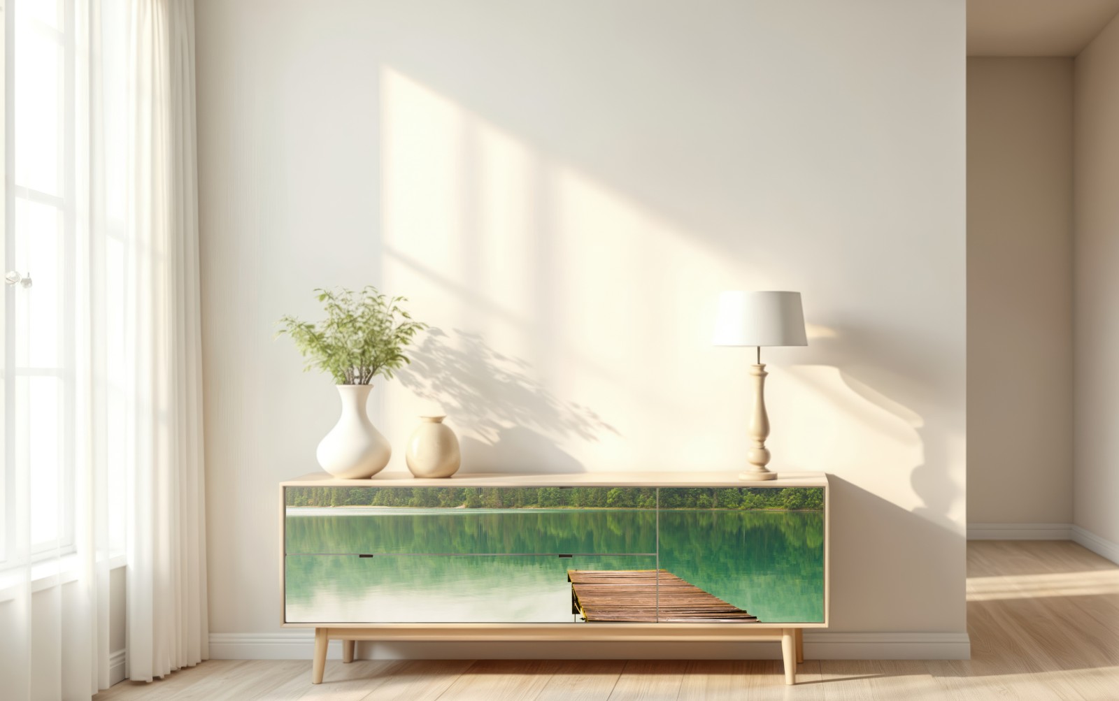 Eine ruhige, neblige Seelandschaft mit einem verwitterten Holzsteg über türkisgrünem Wasser, perfekt um natürliche Stimmung ins Zuhause zu holen.