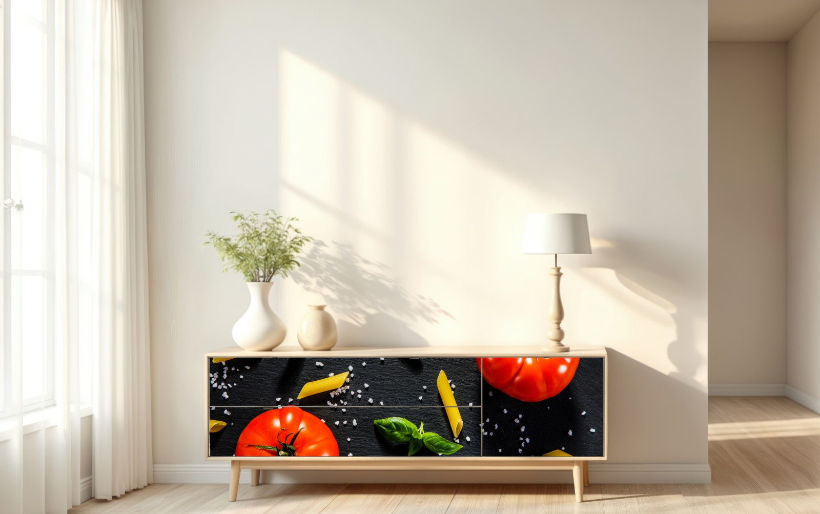 Repositionierbarer Aufkleber tomaten und penne auf schwarzem schiefer