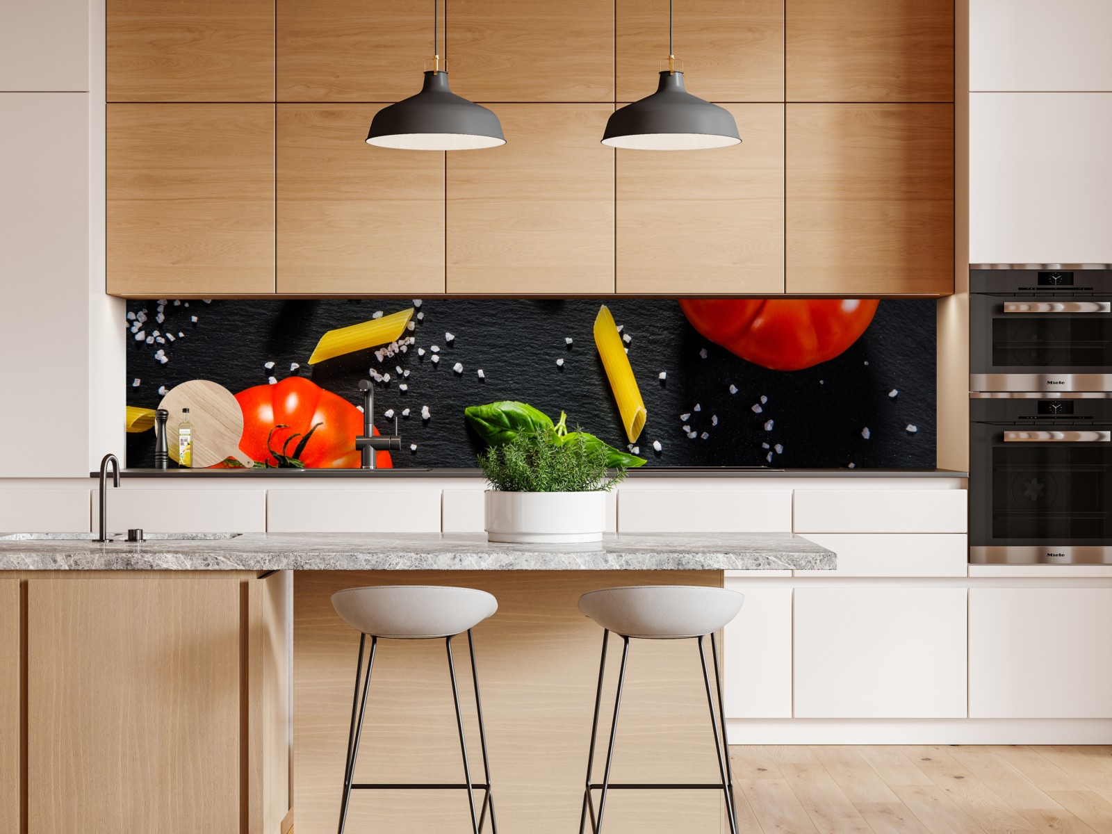 leuchtende tomaten, penne und frisches basilikum auf dunklem schiefer schaffen ein stilvolles wandmotiv für die küche.