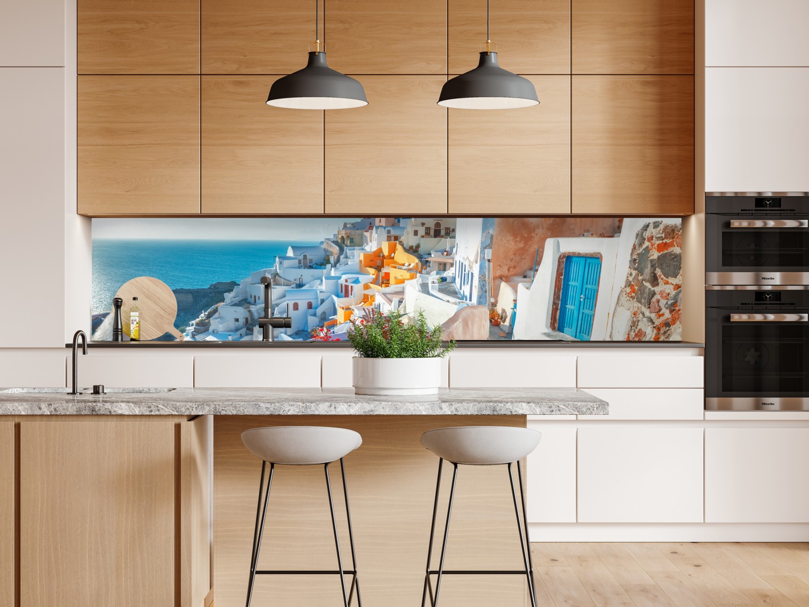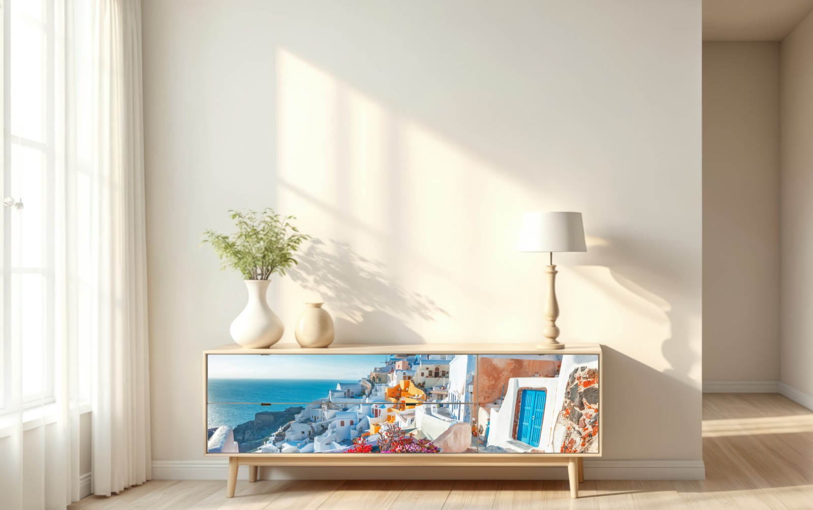 heller Santorini-meeresblick bringt mediterranes flair und ruhe in jeden raum mit charakteristischen weißen häusern, blauem meer und bunten blumen.