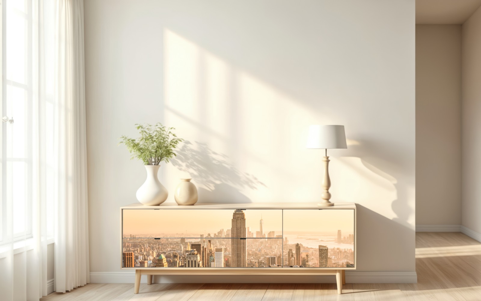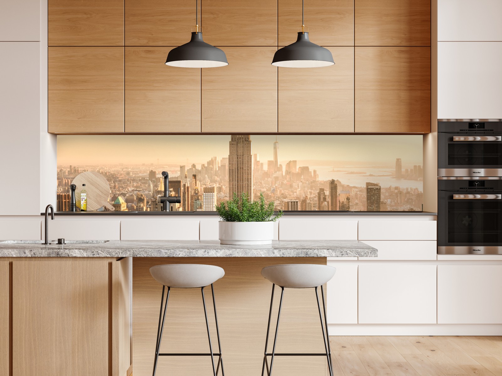 Warme goldene Ansicht der New York Skyline mit ikonischen Wolkenkratzern, ideal zur Aufwertung moderner Innenräume.