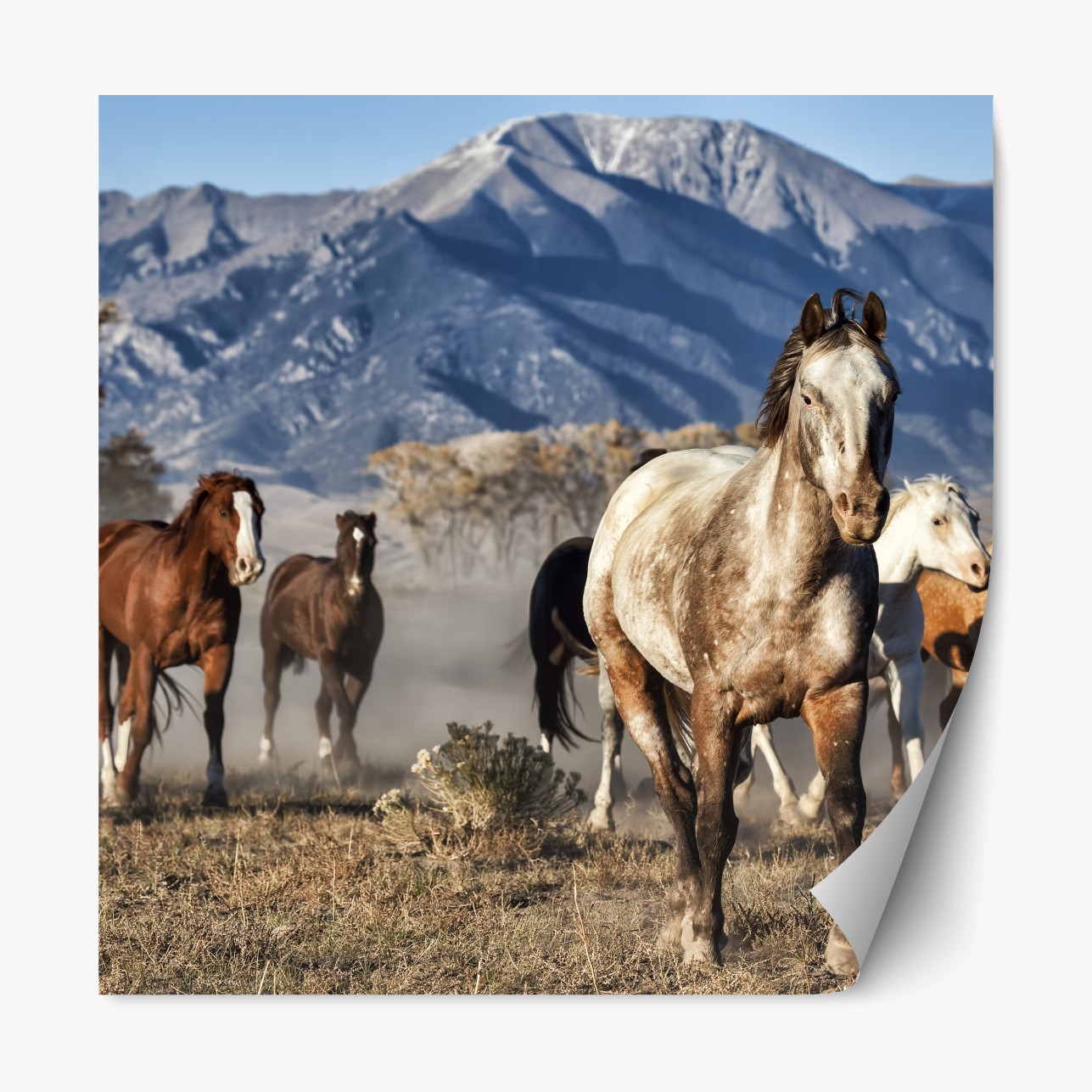 Repositionierbarer Aufkleber Wilde pferde galoppieren auf gebirgswiese