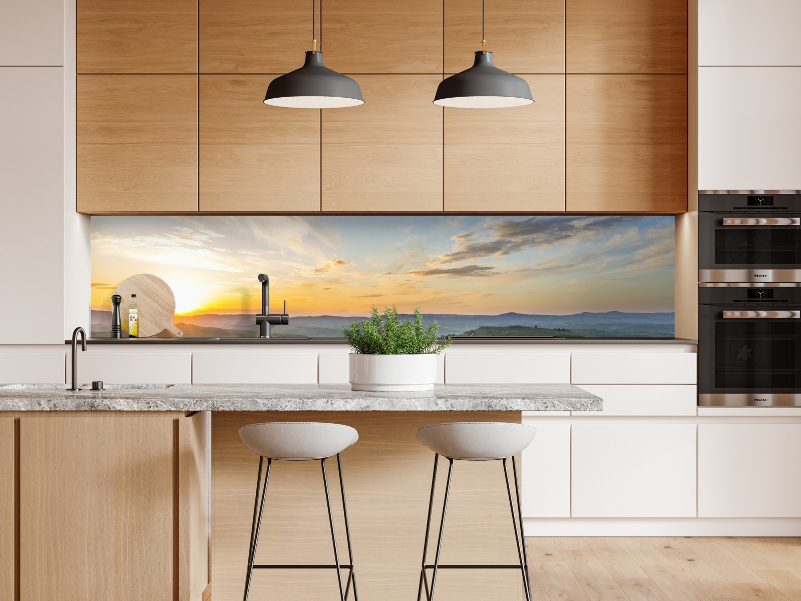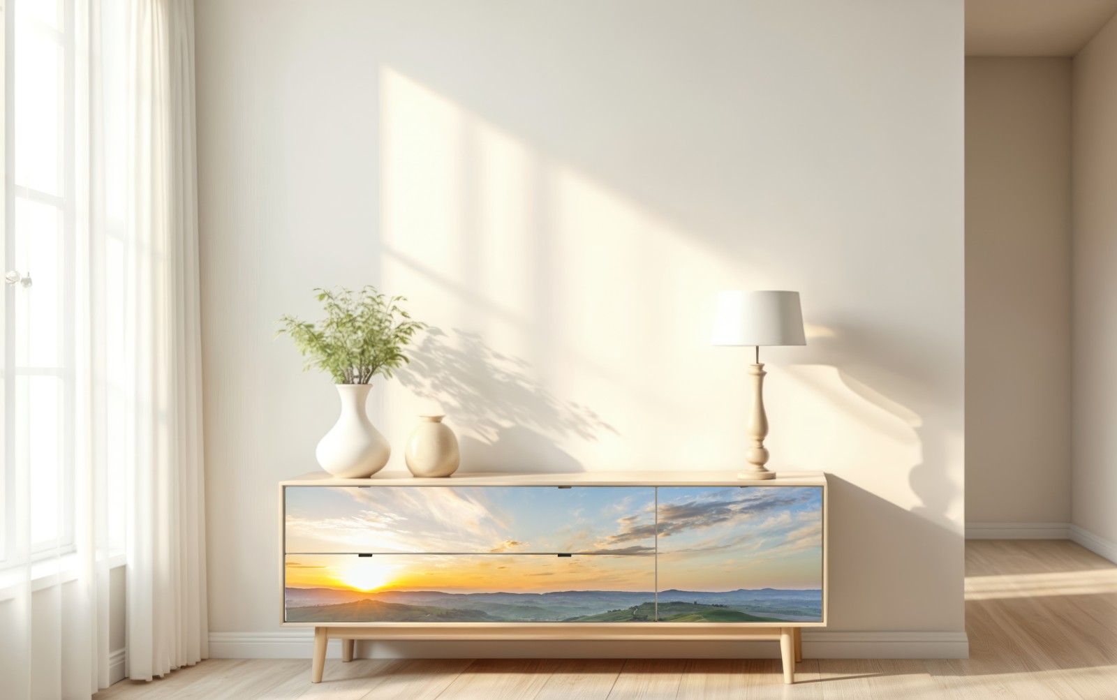 Fangen Sie die beruhigende Schönheit der Morgendämmerung in der italienischen Landschaft ein, mit goldenem Licht über sanften grünen Wiesen, ideal um die Ruhe der Natur ins Zuhause zu holen.