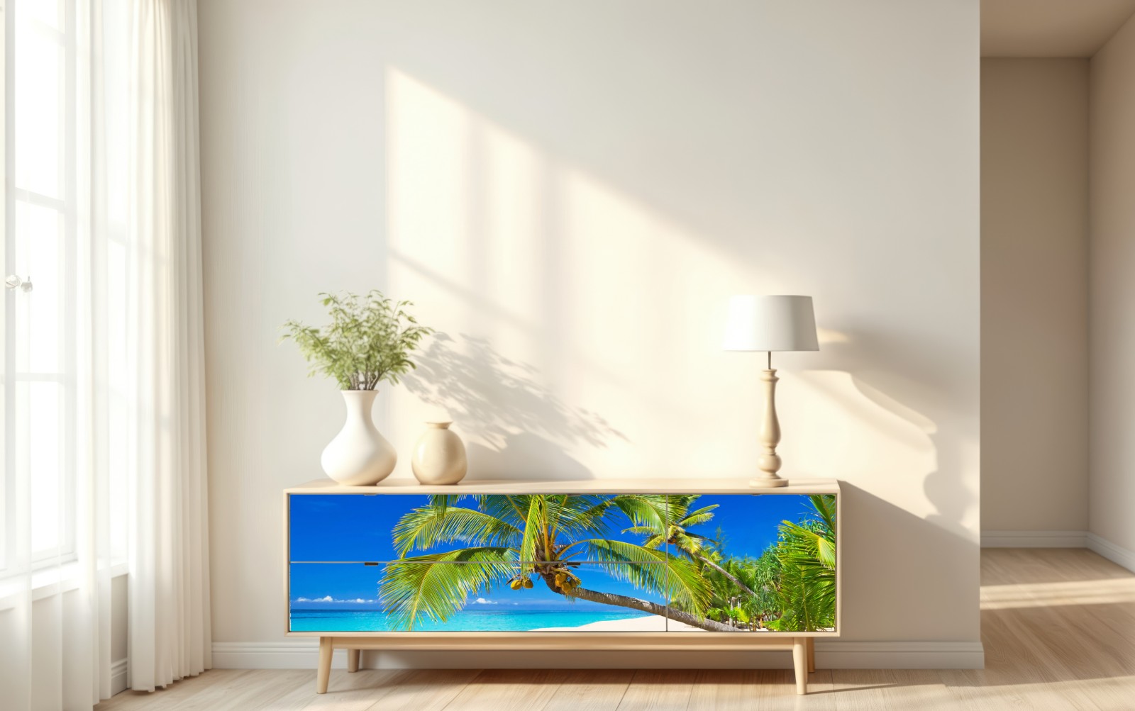 Bringen Sie tropische Gelassenheit in Ihr Zuhause mit diesem lebendigen Foto eines türkisfarbenen Meeres, wiegenden Palmen und makellosem weißen Sand.