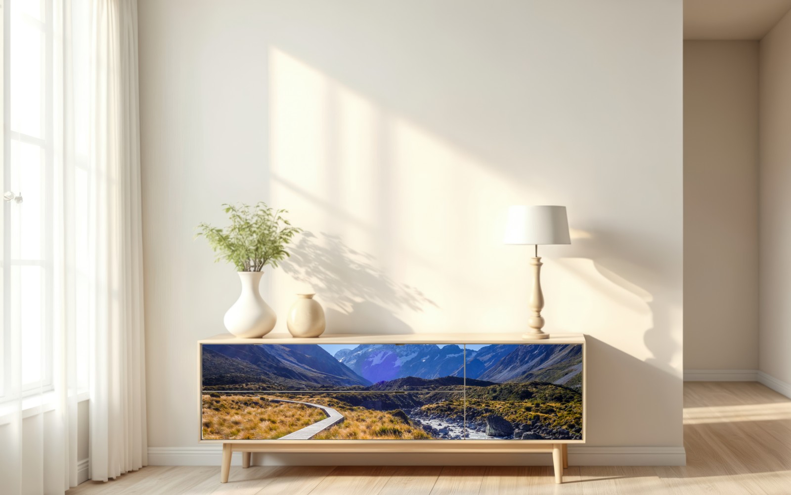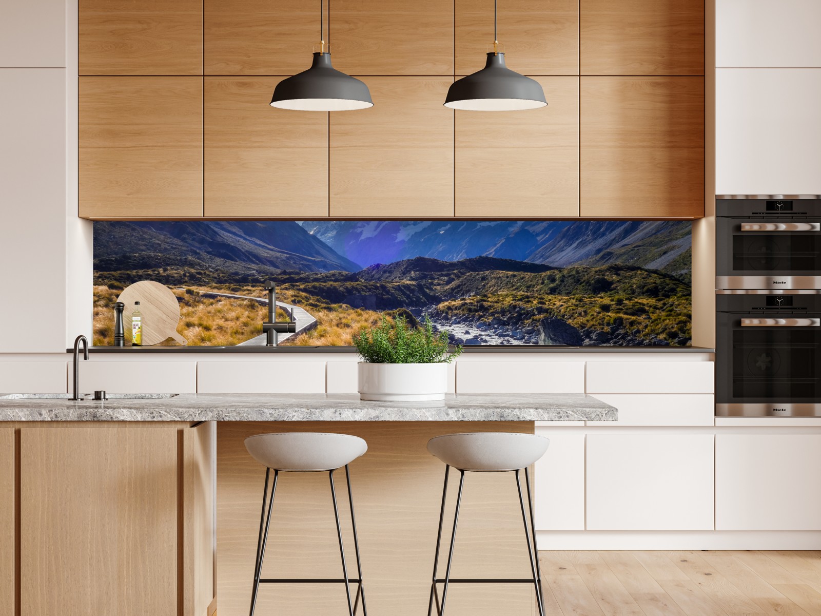 Atme alpine Ruhe ein mit dem weiten Blick auf Aoraki Mount Cook und dem geschwungenen Holzsteg im Hooker Valley, ideal um Natur ins Zuhause zu holen.
