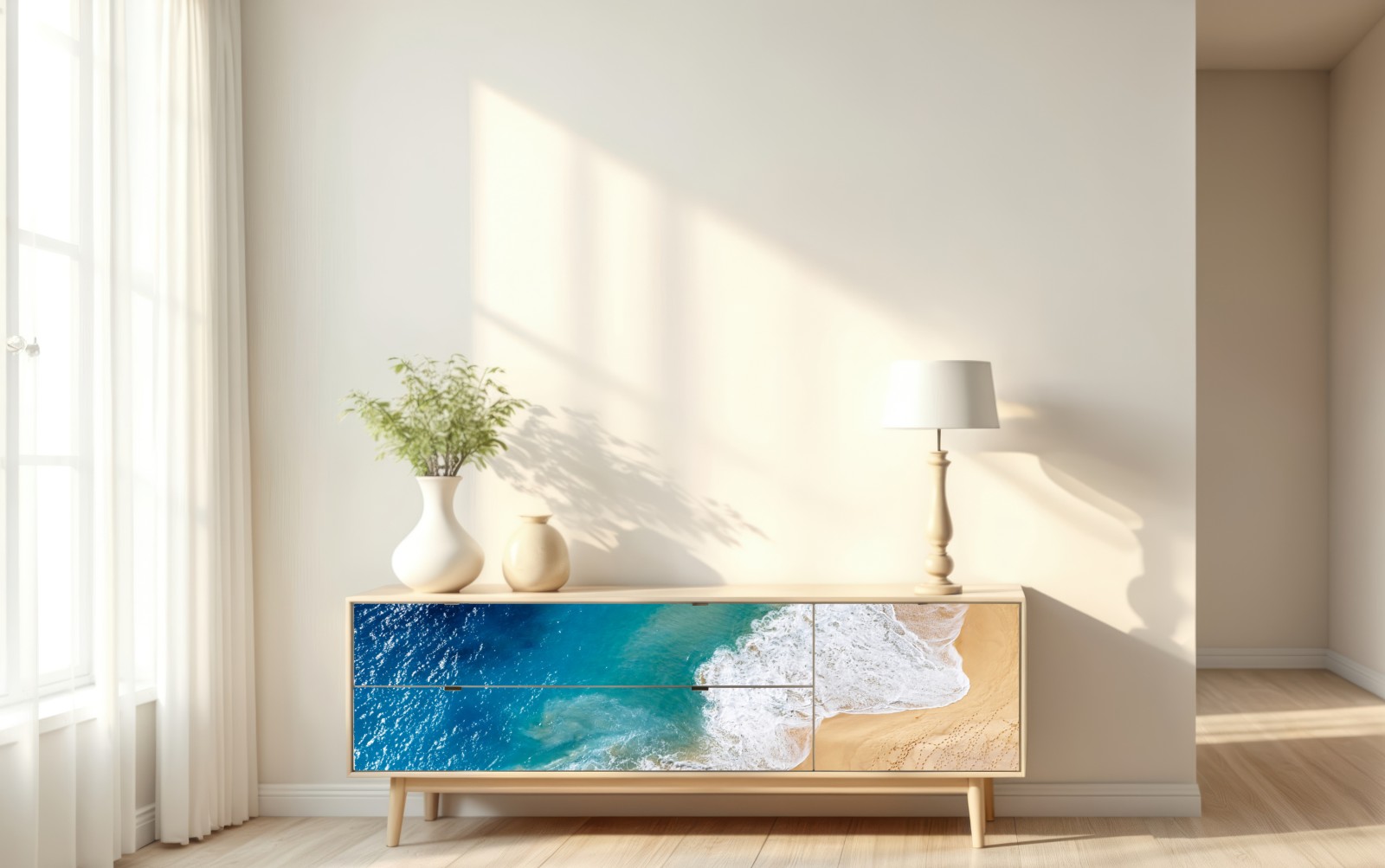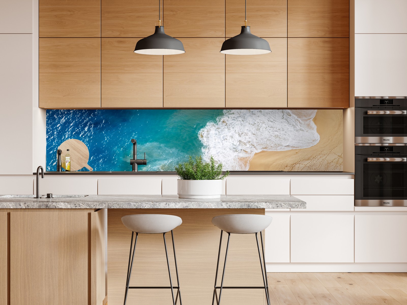 Beeindruckende Luftaufnahme einer tropischen Strandlandschaft mit türkisfarbenem Wasser und goldenem Sand, ideal um maritimen Flair ins Zuhause zu bringen.