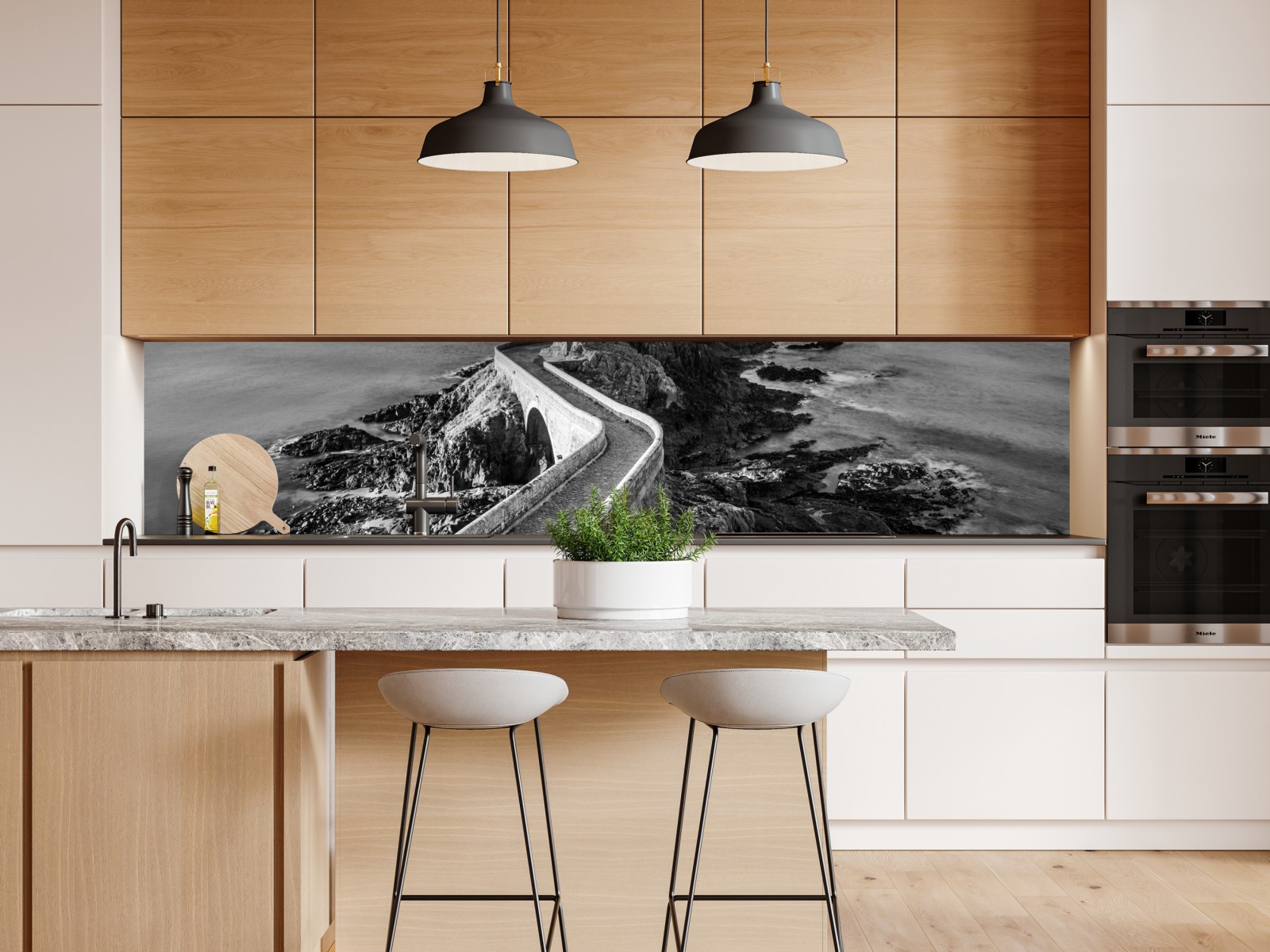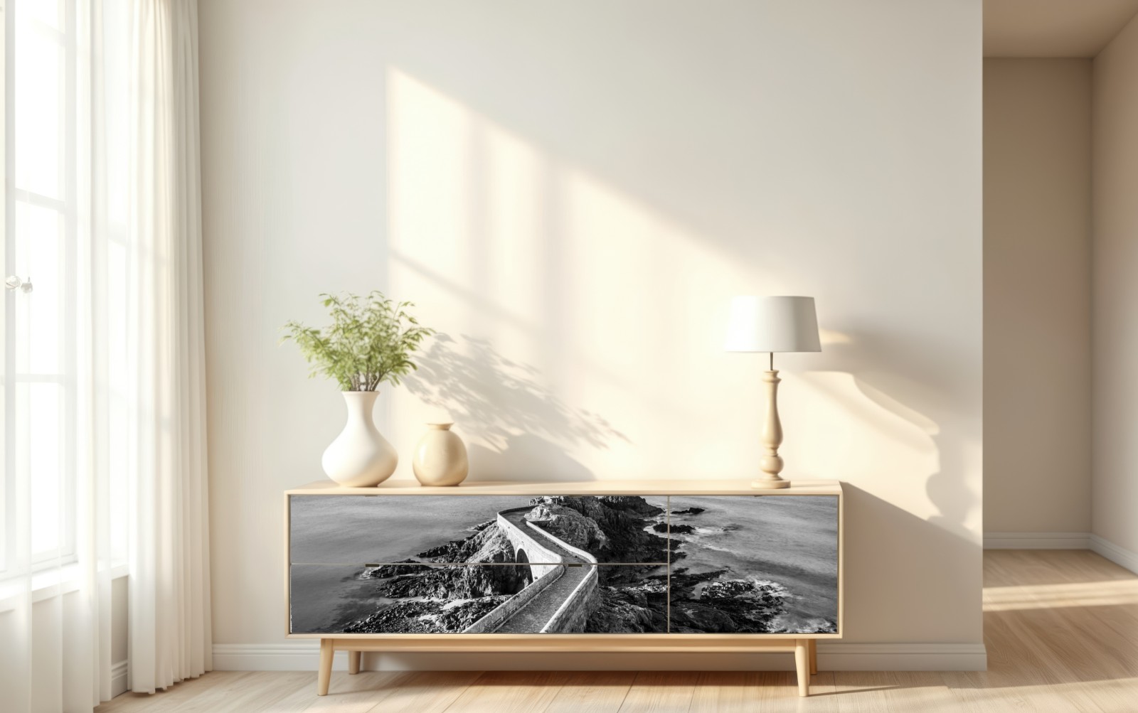 Dramatisches schwarzweiß-foto eines leuchtturms auf einer felsigen halbinsel mit einem geschwungenen steinweg, ideal um räumen maritimen minimalismus zu verleihen.