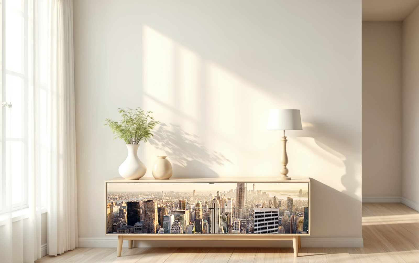 Beeindruckende Ansicht der New York Skyline im warmen Morgenlicht, perfekt um urbanes Flair in Ihren Raum zu bringen.