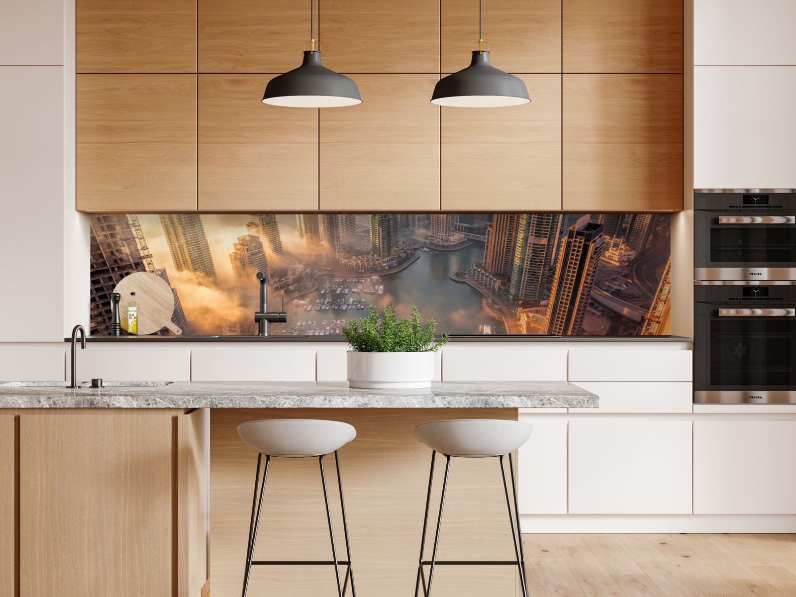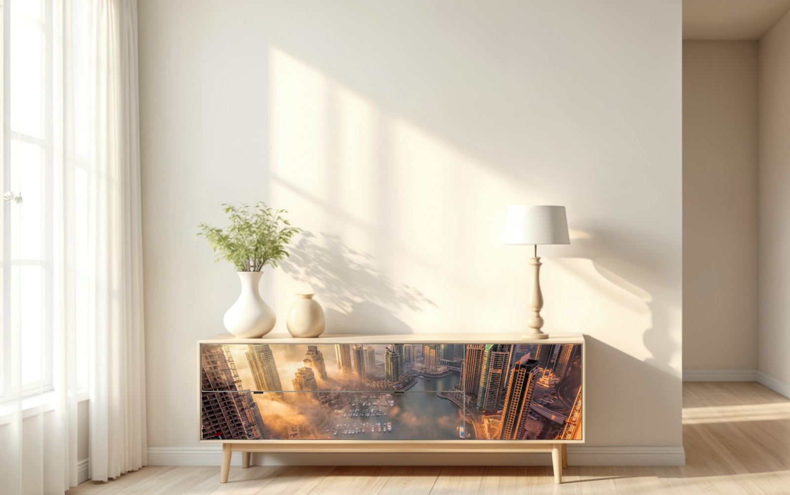 Atemberaubende Luftaufnahme der Dubai Marina bei Sonnenuntergang mit goldenem Licht, ideal für moderne Innenräume.