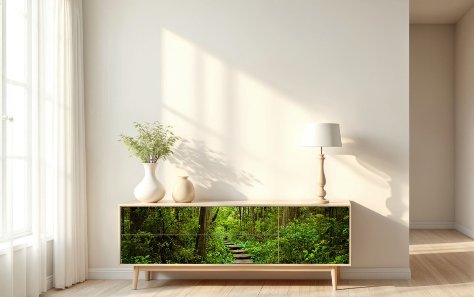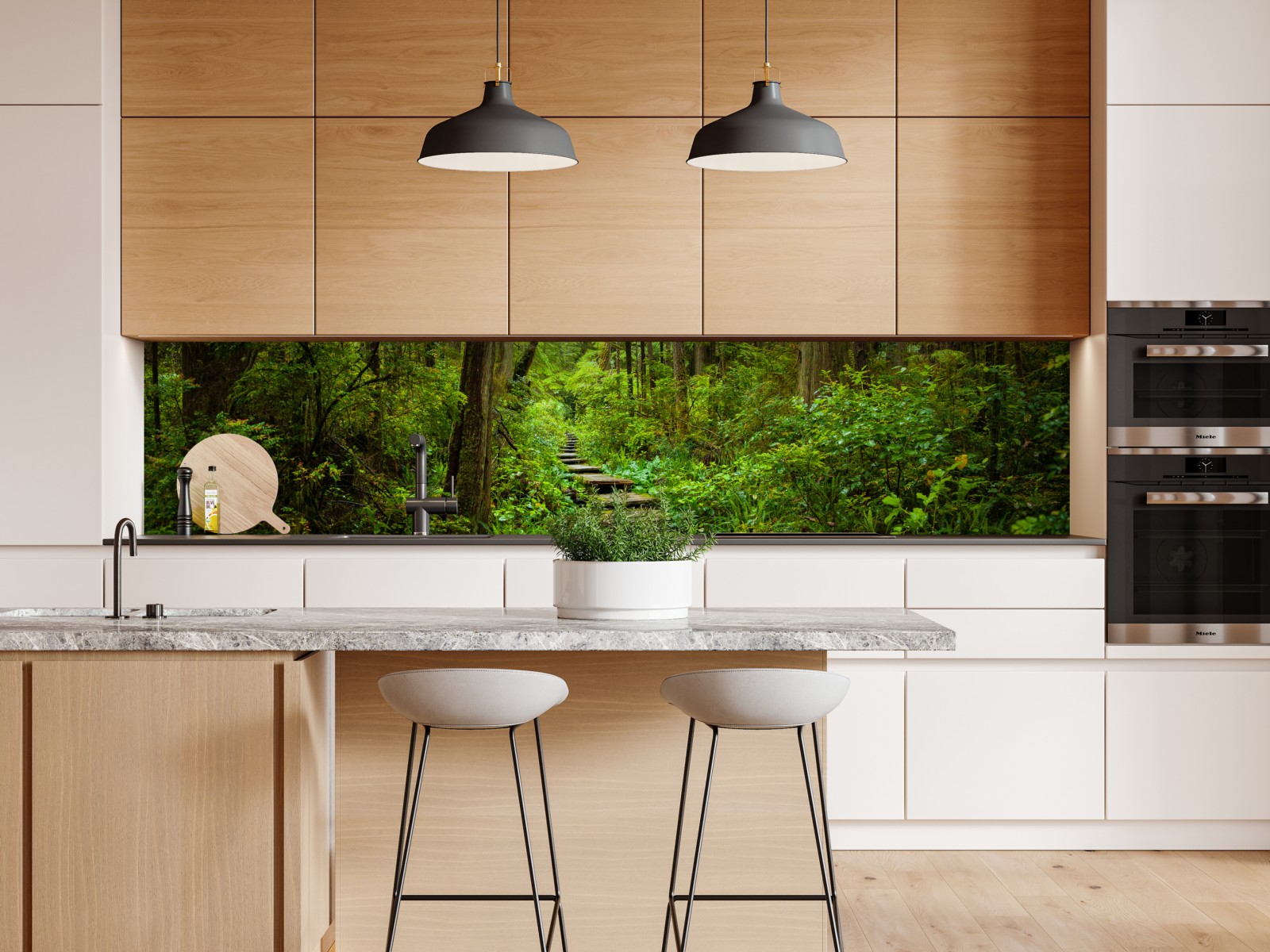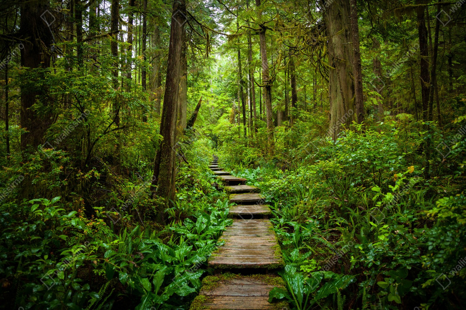 ein ruhiger waldsteg zwischen dichtem grün und farnen, perfekt um natürliche ruhe in ihr zuhause zu bringen.