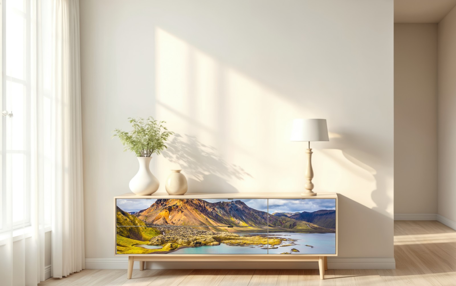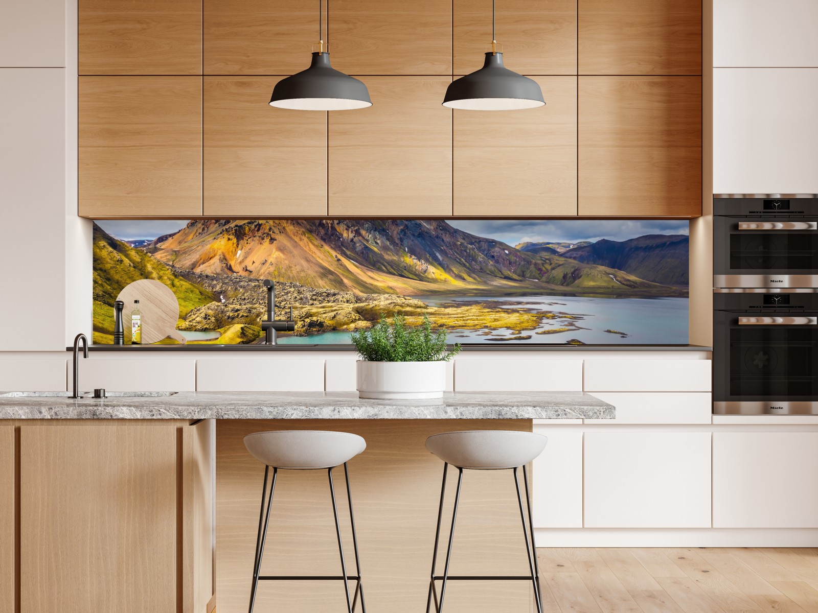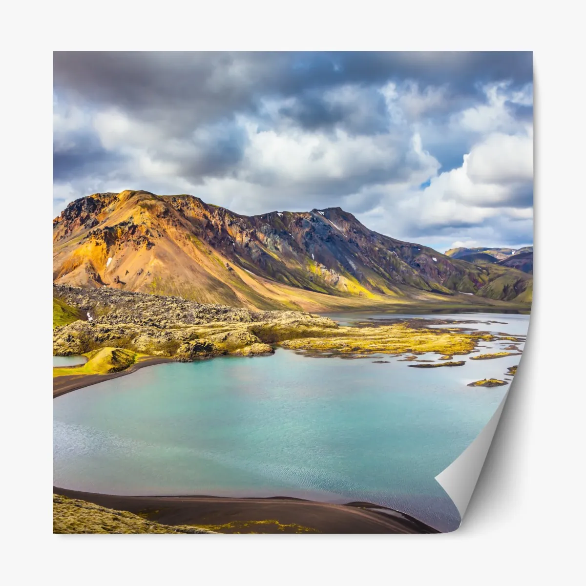 Ruhige Sommerszene mit türkisfarbenem See und bunten Bergen auf Island, ideal um natürliche Ruhe in Ihr Zuhause zu bringen.