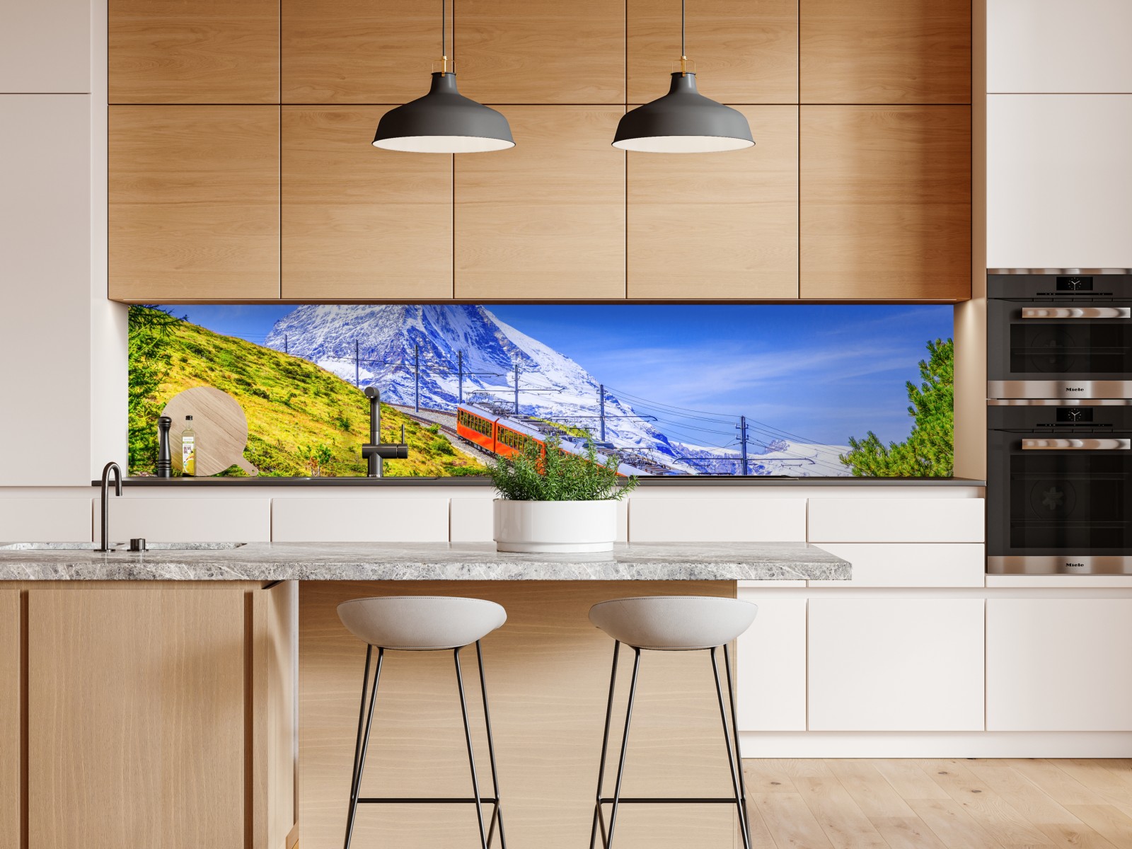 Lebendige Alpenaufnahme mit einem orangefarbenen Bergzug, der zum Matterhorn fährt, perfekt, um Reiseflair und kräftige Farben an Ihre Wand zu bringen.