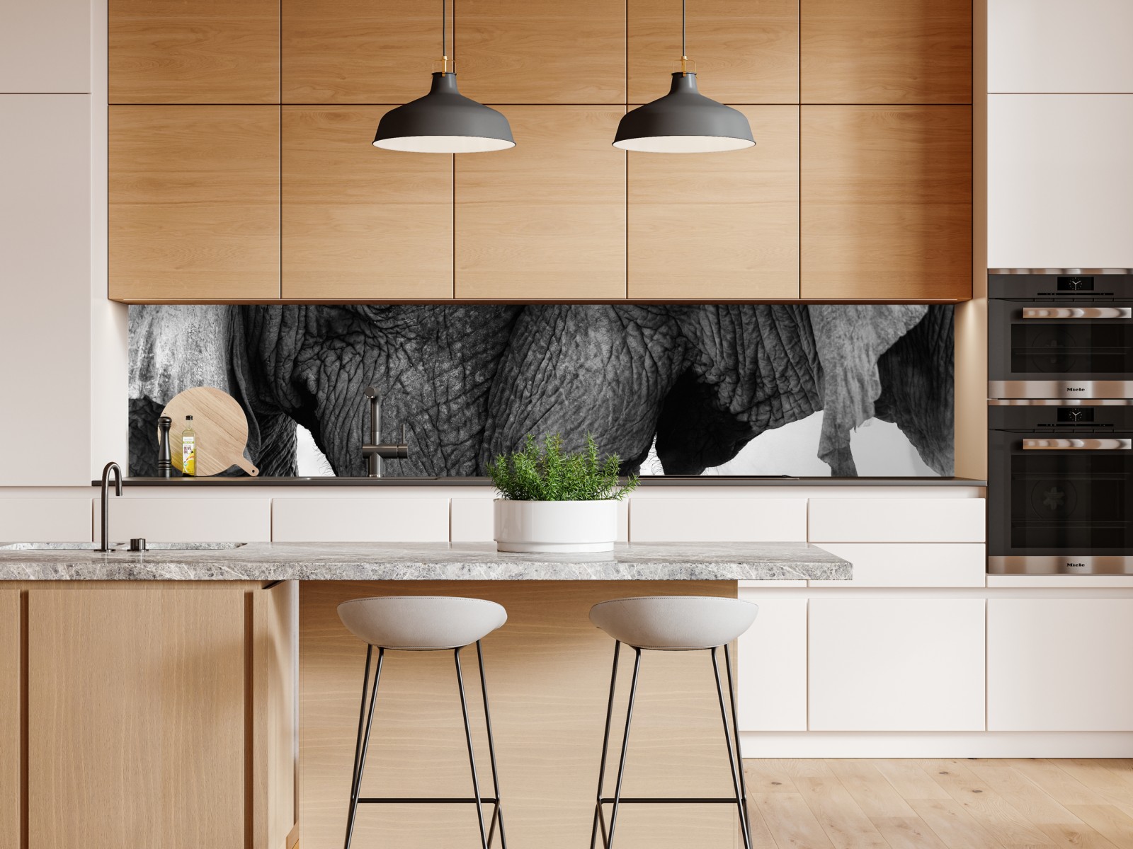 Ein eindrucksvolles schwarzweißes Nahaufnahme von zwei Elefanten, die mit den Stoßzähnen in Berührung sind und rohe Emotionen sowie Hautstruktur zeigen.