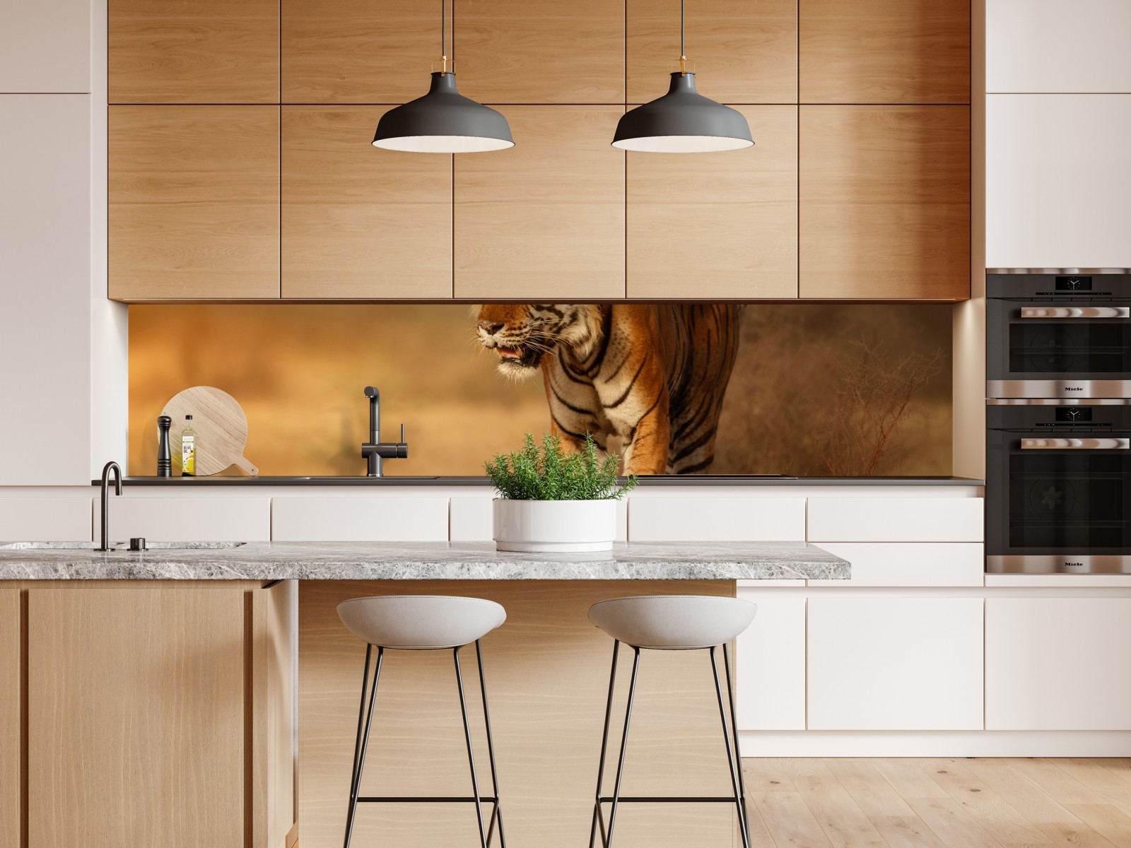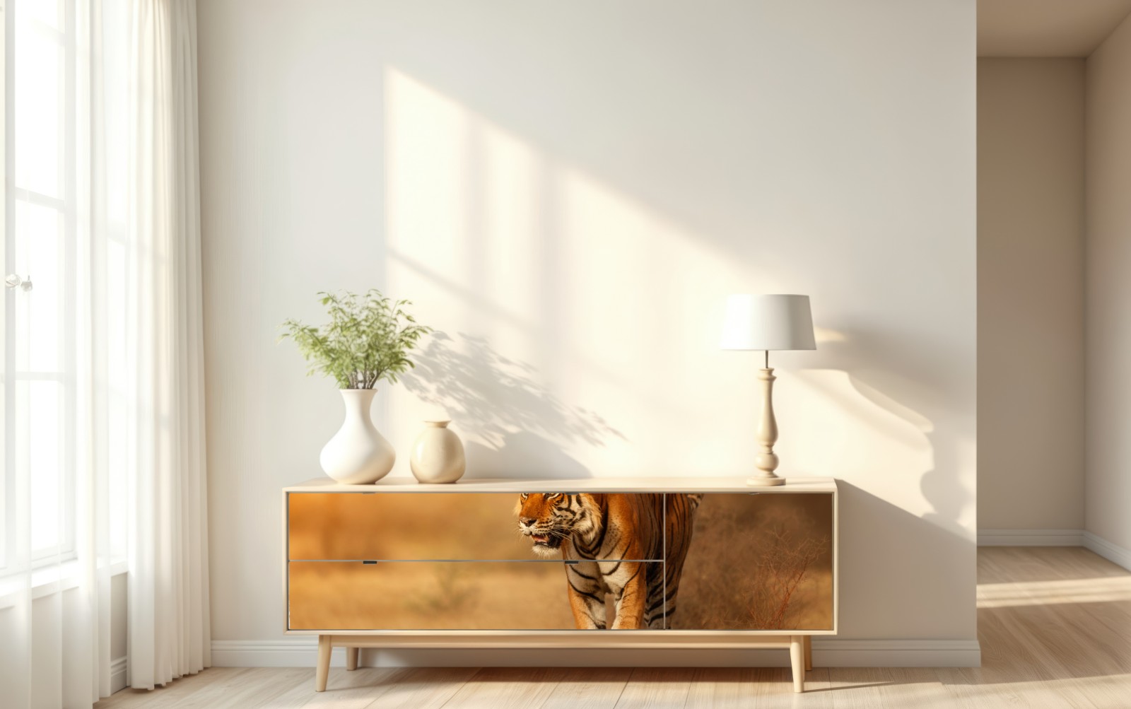 Beeindruckende Nahaufnahme eines Tigers, der durch sonnenbeschienenes Gras schreitet, ein dramatischer und natürlicher Akzent für jedes Interieur.